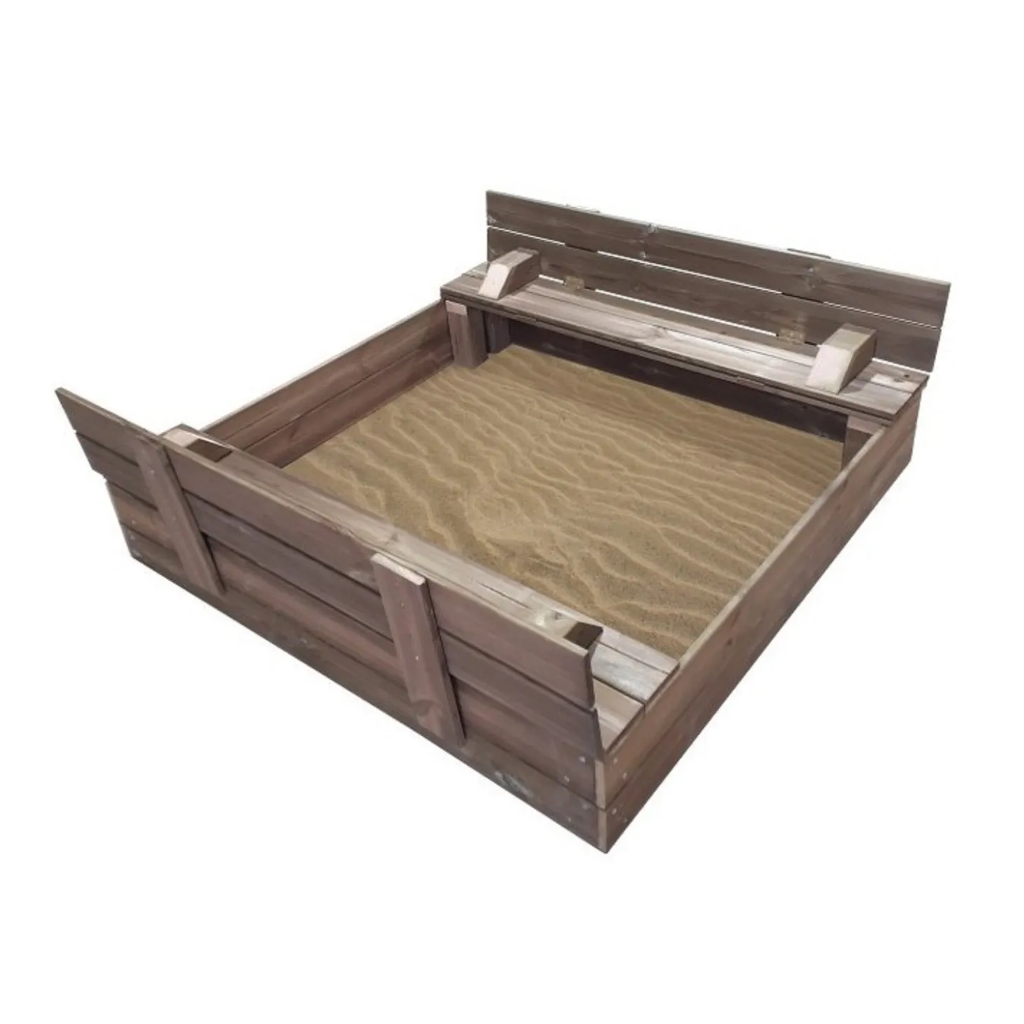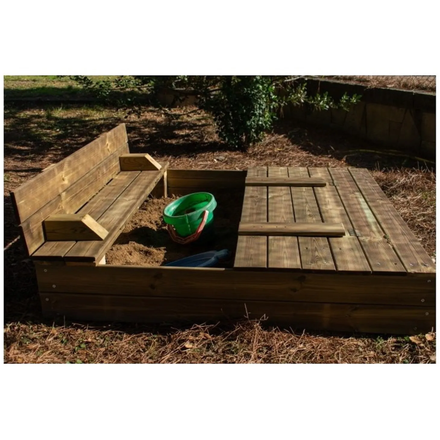 Arenero cuadrado de madera con cubierta para proteger el interior de la lluvia y el viento, ideal para que tus hijos jueguen y se diviertan.