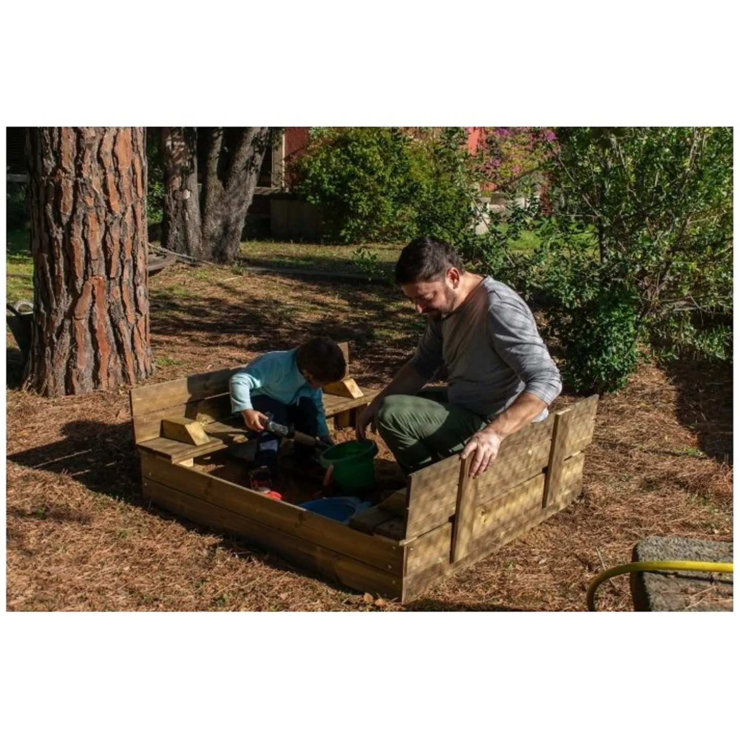 Diseñado con madera tratada para resistir la intemperie, este arenero combina diversión, seguridad y durabilidad en un solo producto. Una de sus principales ventajas es su cubierta plegable, que protege la arena de la suciedad, la lluvia y los animales cuando no se está utilizando. Además, al abrirse, la cubierta se convierte en dos prácticos bancos laterales, ofreciendo un cómodo asiento para que los niños jueguen con total comodidad. Sus bordes redondeados y su estructura estable minimizan los riesgos durante el juego, garantizando un entorno seguro. Además, está fabricado con materiales de alta calidad y cumple con las normativas europeas, brindando tranquilidad a los padres. Jugar en la arena estimula la imaginación, la coordinación y el desarrollo táctil de los niños, permitiéndoles crear castillos, excavar y experimentar con diferentes texturas. Fácil de montar y con un diseño funcional, es una excelente opción para transformar cualquier jardín en un espacio de juego seguro y divertido.