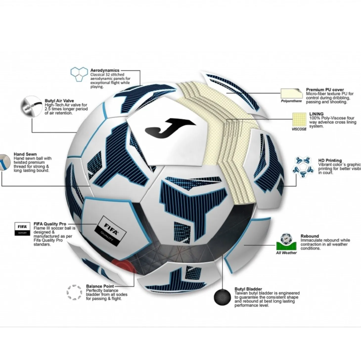 Este modelo de Joma tiene unas características únicas que hacen que sea prácticamente perfecto. Es un balón diseñado con 32 paneles que proporcionan una aerodinámica perfecta cuando el balón no está tocando el suelo, además de ser fabricado con PU premium, dando un control perfecto al chutar, pasar o driblar con él. Incorpora una cámara interior de butilo, así como la válvula, que permiten que se mantenga hasta 2’5 veces más tiempo el aire. Está fabricado con los estándares de calidad de la FIFA (FIFA Quality Pro) e incorpora una vejiga perfectamente equilibrada desde todos los lados para permitir una trayectoria perfecta y con un rebote perfecto en cualquier condición climática. Además, ha sido cosido a mano atendiendo a la calidad y con un diseño vistoso y colorido combinando diferentes tonos de azules y blancos.