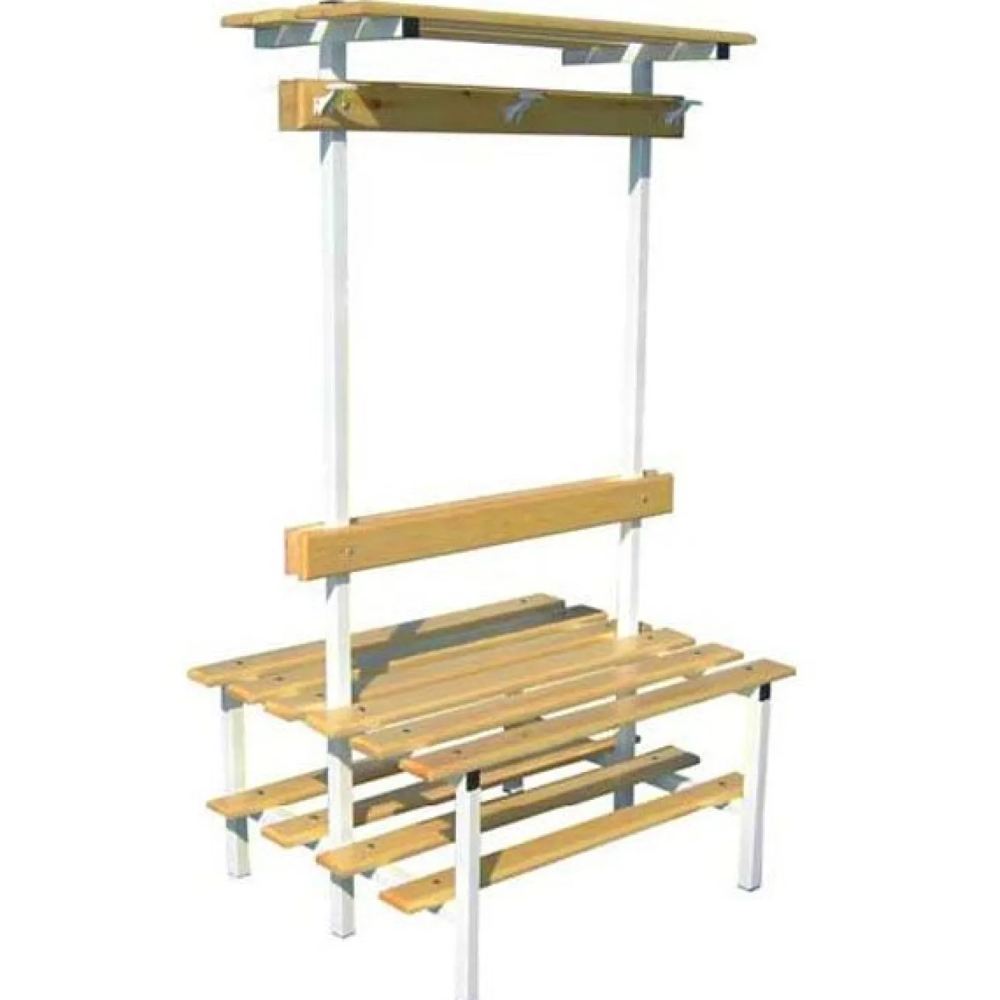 Banco vestuario completo de doble cara, compuesto de estante zapatillero, asiento, respaldo perchero y estante superior. Diferentes medidas disponibles.