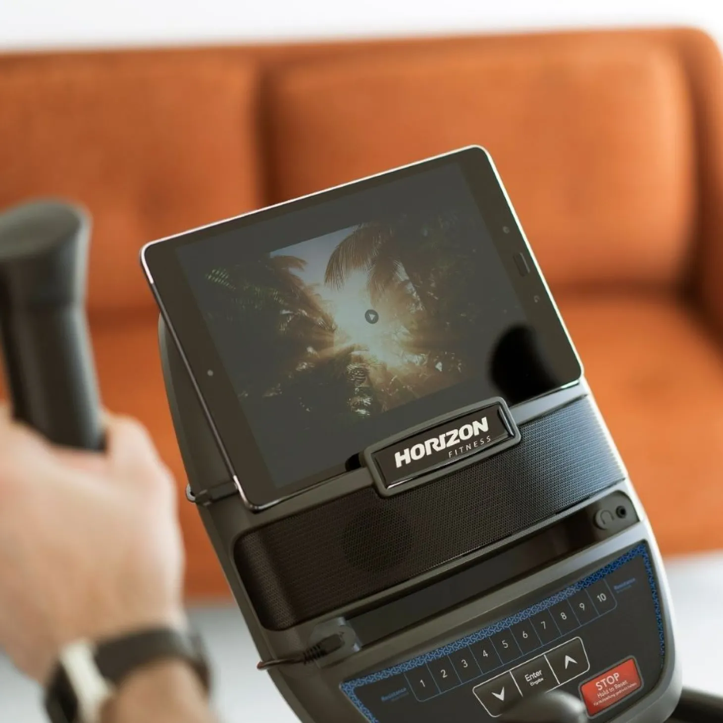 Realiza cada uno de los ejercicios sobre esta elíptica al ritmo de tu música favorita gracias su conectividad bluetooth y a los altavoces integrados con un soporte seguro para dispositivos. Además, un puerto USB de carga rápida incluido mantiene tu dispositivo completamente alimentado mientras te mueves. Incorpora sensores grips de contacto para controlar tu frecuencia cardíaca y un soporte para tu botella de agua.