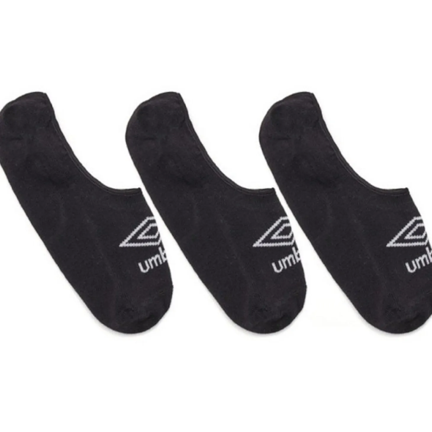 Cómodos y resistentes calcetines invisibles de Umbro en color negro, perfectos para tu día a día o para tus entrenamientos deportivos. Pack 3 unidades en color negro.