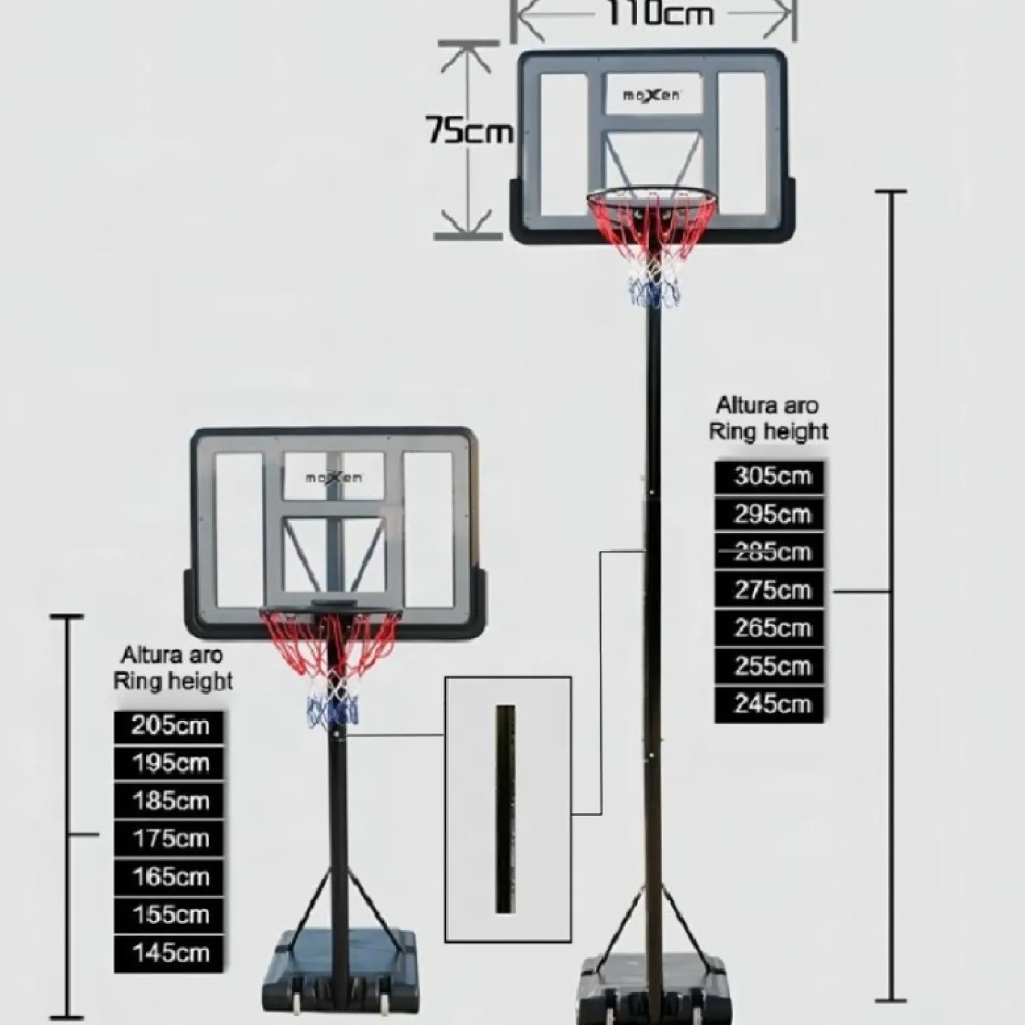 Esta nueva canasta trasladable de baloncesto de Moxen tiene altura regulable (145 a 305cm) y base de contrapeso para asegurar la estabilidad.