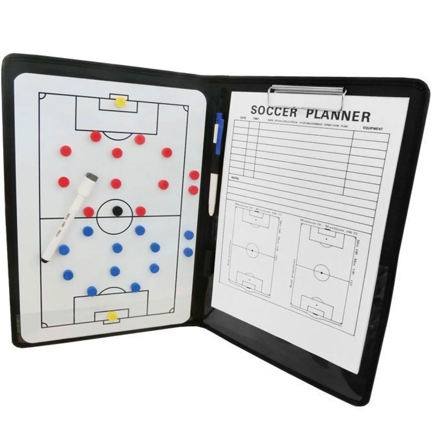Carpeta magnética de fútbol para entrenadores con todo lo necesario para poder organizar un equipo en los partidos. Es ideal para explicar las técnicas y estrategias del juego.
