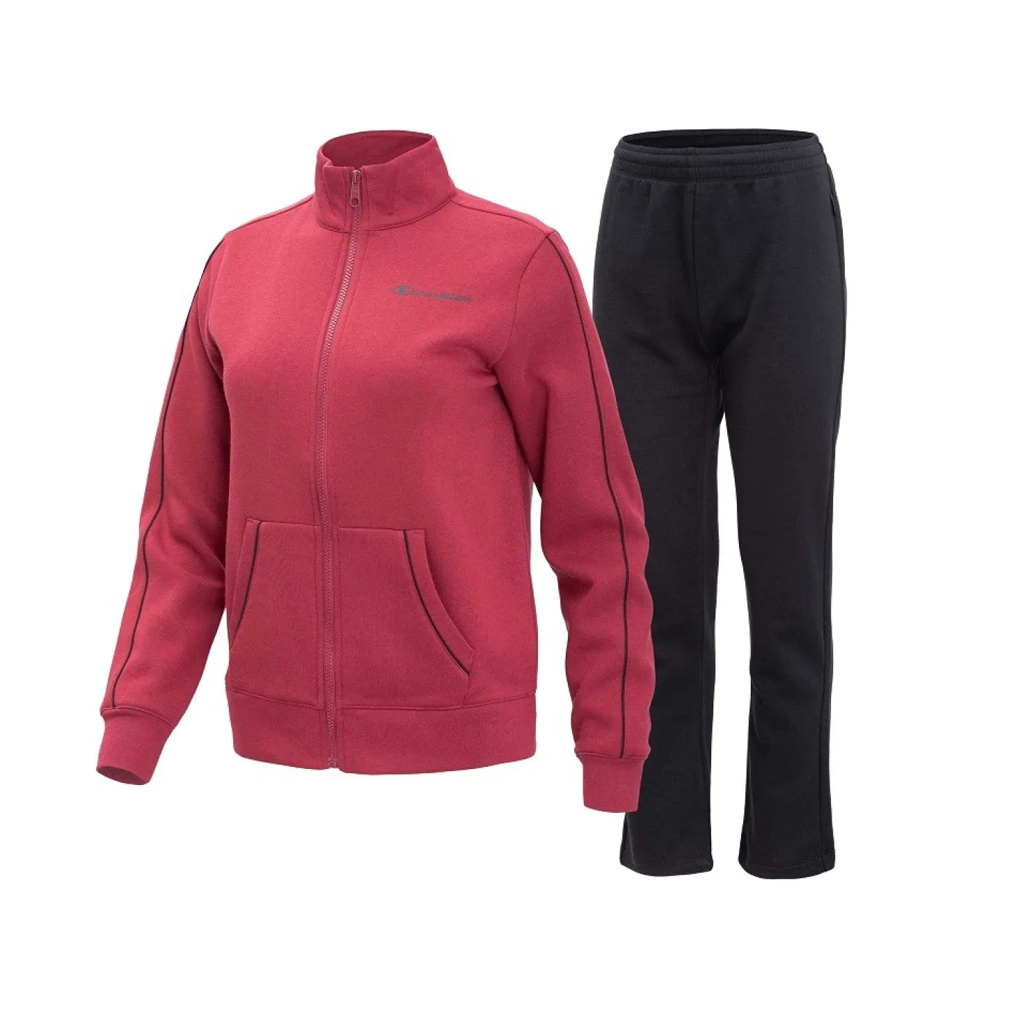 El chándal está compuesto de dos piezas: la parte de arriba es una chaqueta de color rojo con cierre de cremallera completa y dos bolsillos delanteros. Tiene un cuello alto para protegerte del frio además de unos puños acanalados para un mejor ajuste proporcionándote una comodidad extraordinaria. La parte de abajo es un pantalón de toque holgado fabricado en algodón y poliéster en el que incluye dos bolsillos laterales para mantener tus objetos personales seguros y a mano. Incluye una cintura elástica que se adapta a cualquier forma.