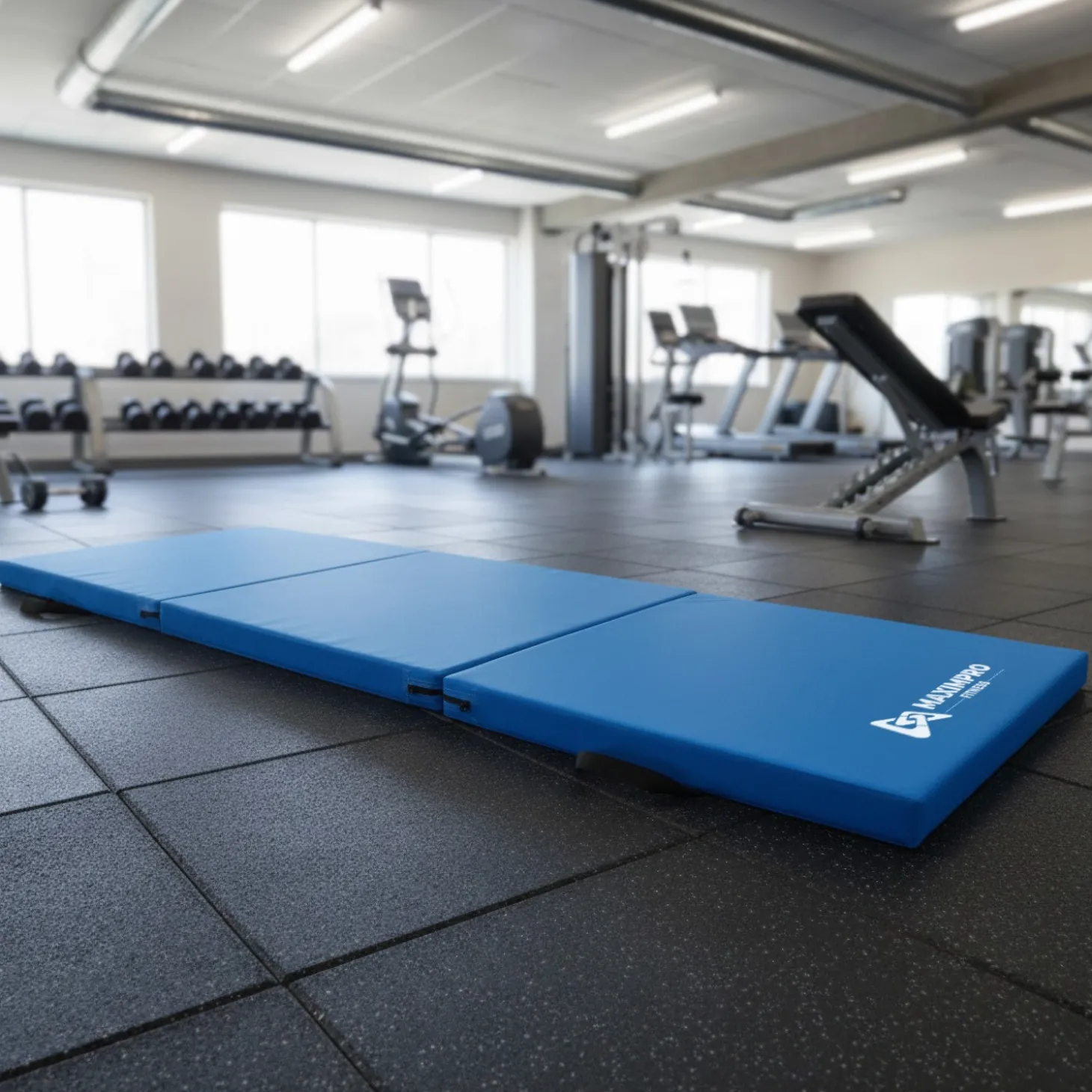 La colchoneta plegable de fitness Maximpro Tula en color azul ofrece comodidad, resistencia y fácil transporte, perfecta para entrenamientos en casa o en el gimnasio.