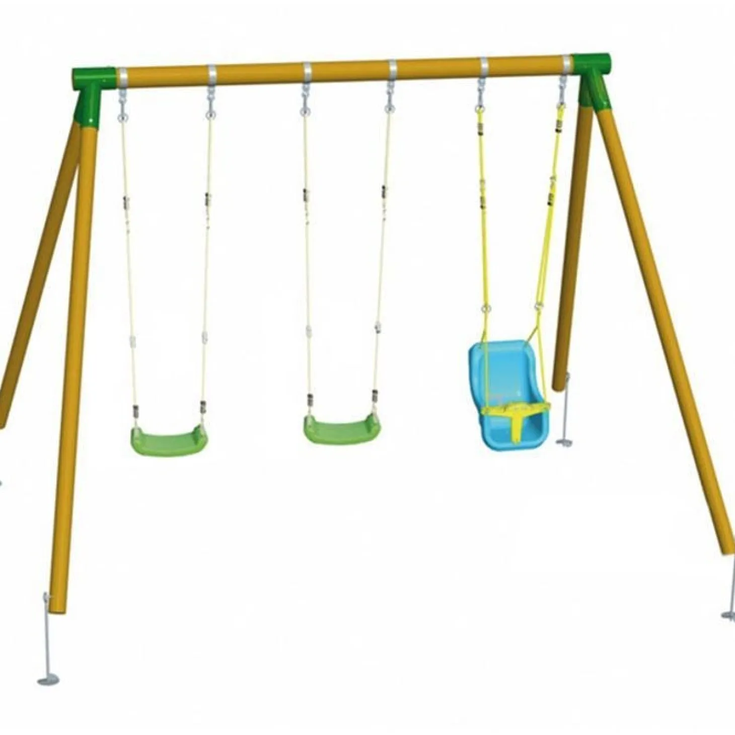 Columpio Etna triple de madera con dos asientos individuales con base de plástico y un asiento de bebé para que puedan divertirse hasta los más pequeños de la casa. Todo en un mismo columpio de madera pensado para el jardín de casa y que tus hijos puedan divertirse sin límite.