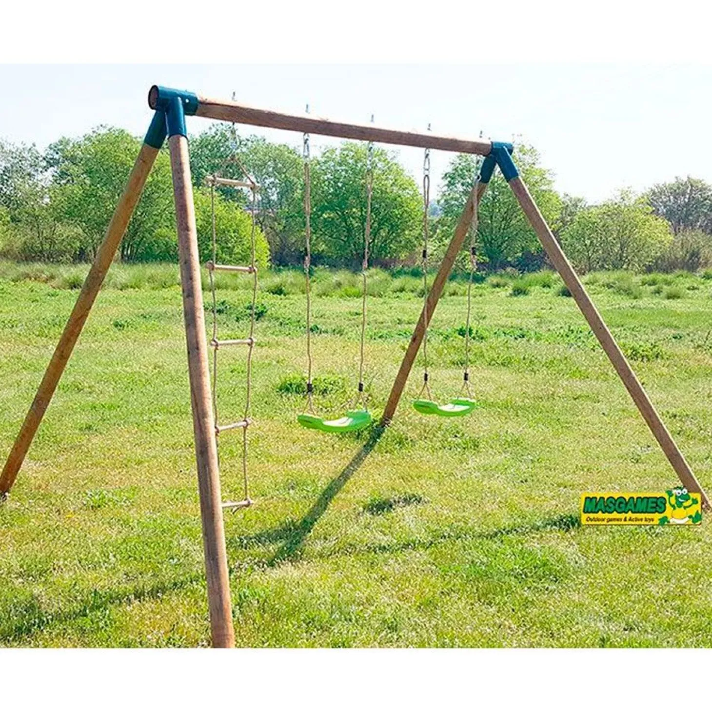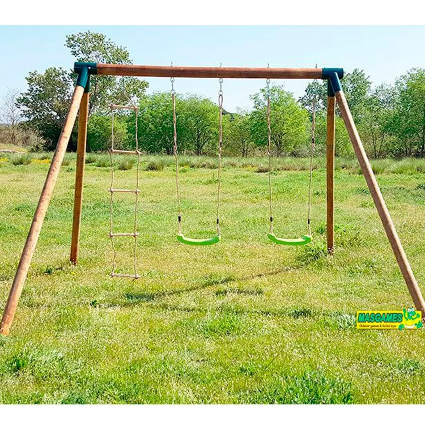 Columpio con dos asientos y escala. Maderas seleccionadas y oscurecidas con tratamiento no tóxico. Incluye todo lo necesario para su montaje.