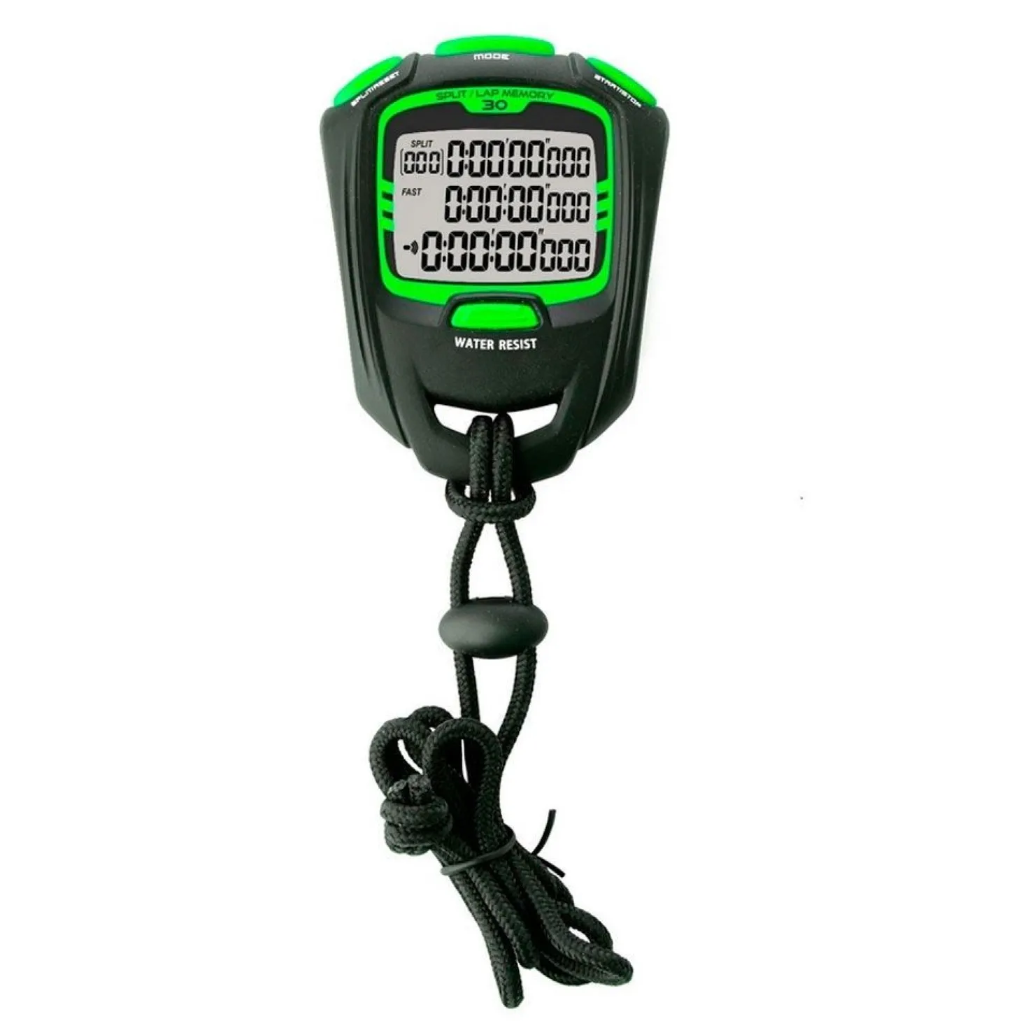 Completo cronómetro deportivo con 30 memorias y pantalla con tres líneas para disponer de toda la información a la vista. Estructura resistente al agua.