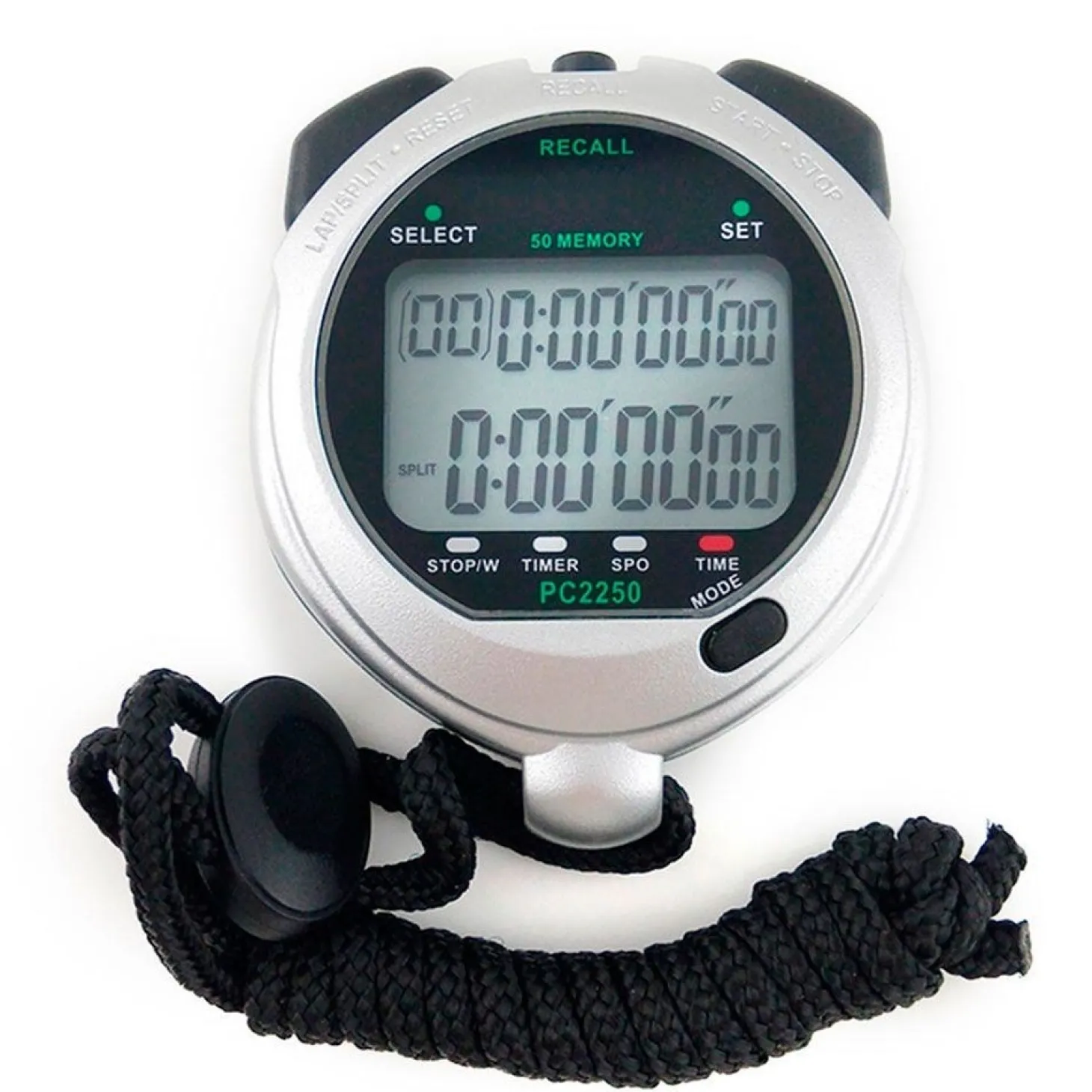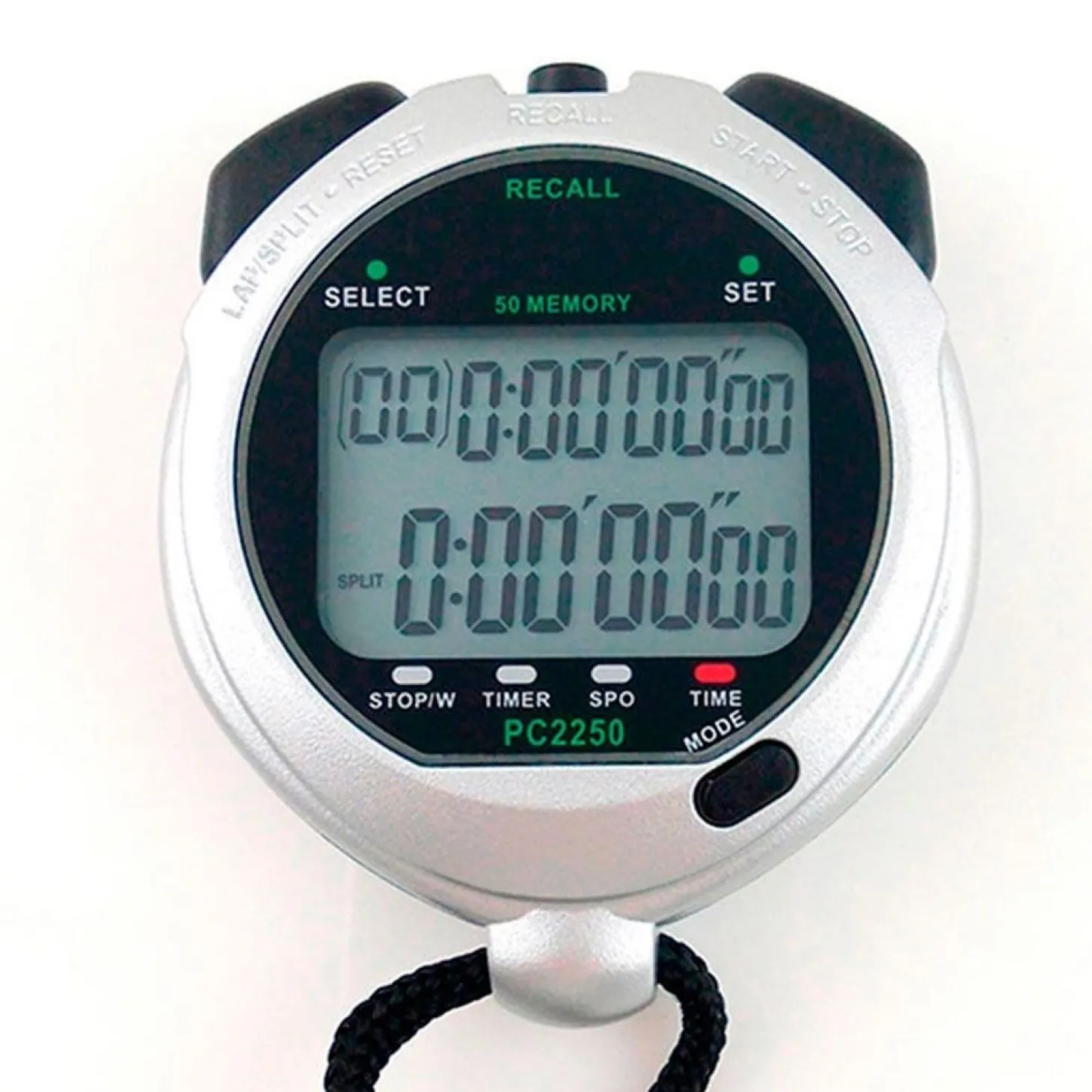 Cronómetro deportivo Precision Sprint 50. Pantalla LCD con números grandes dispuestos en dos filas. Tiempos de vuelta y acumulado. Recupera tiempos anterior y posterior. Resistente al agua. Incluye pila de litio CR-2032 y cordón.