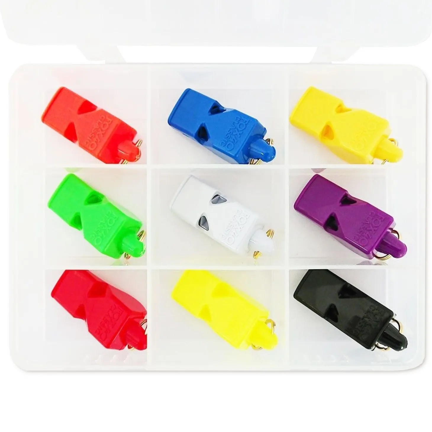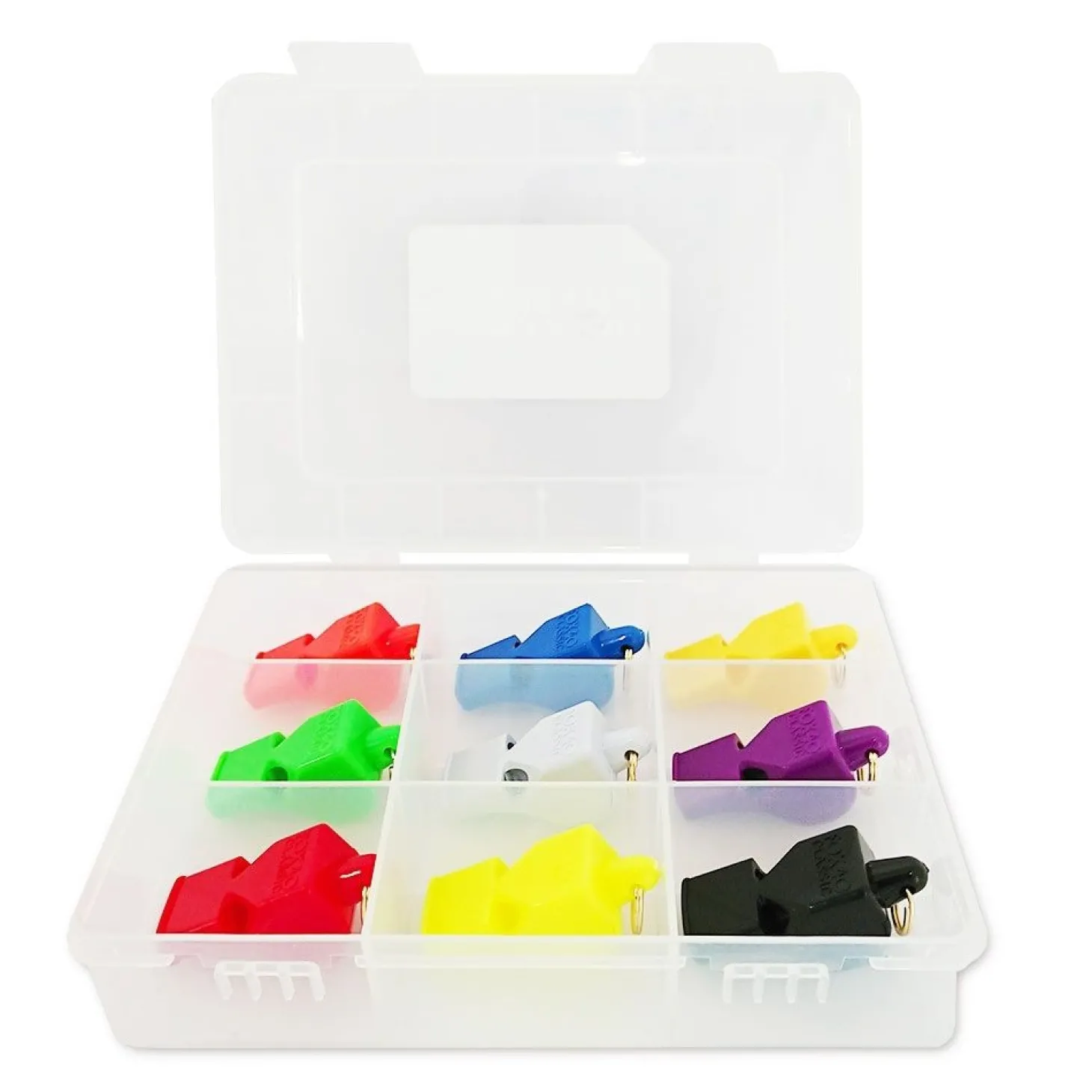 Si quieres guardar tus silbatos puedes hacerlo en este práctico estuche transparente con capacidad para nueve silbatos, perfecto para guardarlos de manera ordenada. Puedes coger fácilmente el silbato que vayas a utilizar gracias a su fácil apertura.