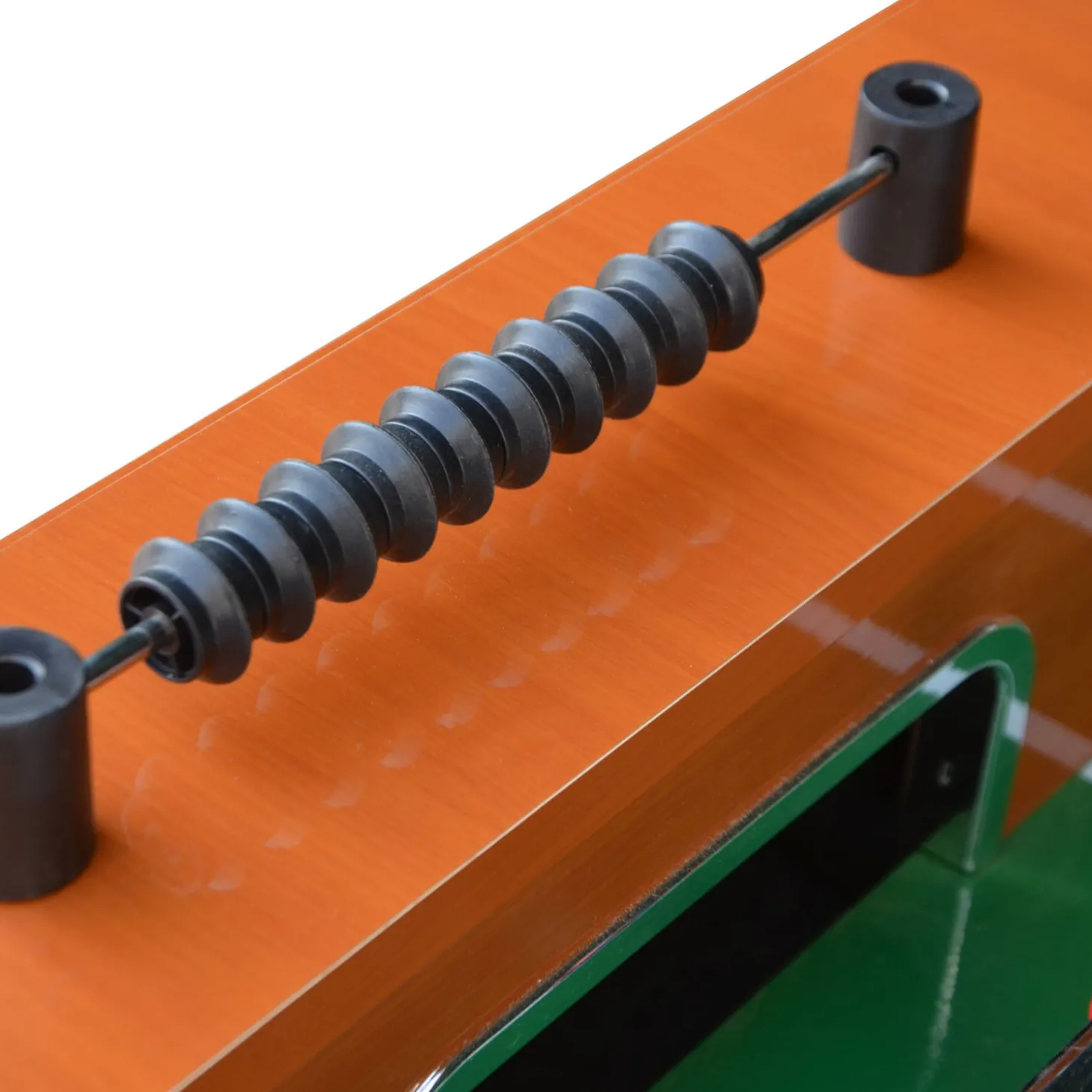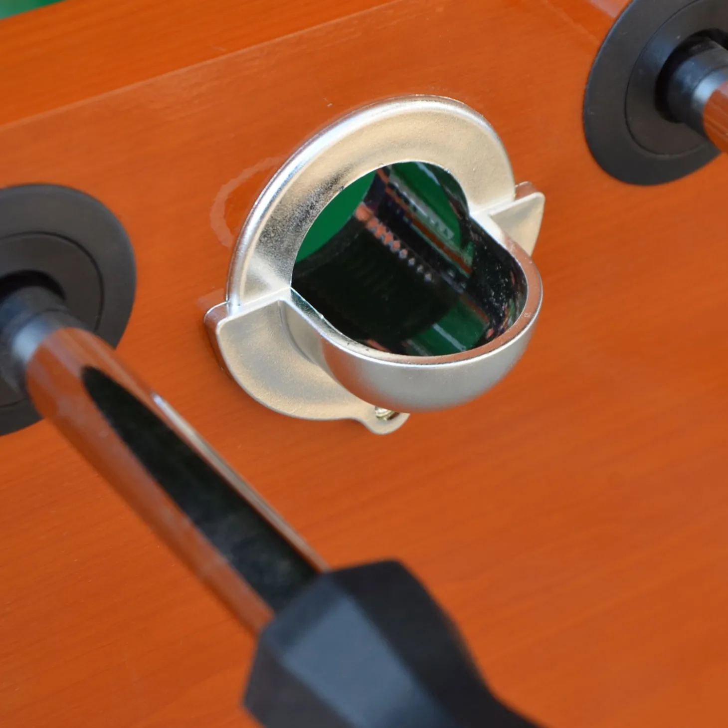 Este futbolín de gran tamaño ha sido fabricado con cantoneras con refuerzos y poterías con travesaños cromados. Además, incorpora niveladores de pata para colocar el futbolín Premier listo para jugar.