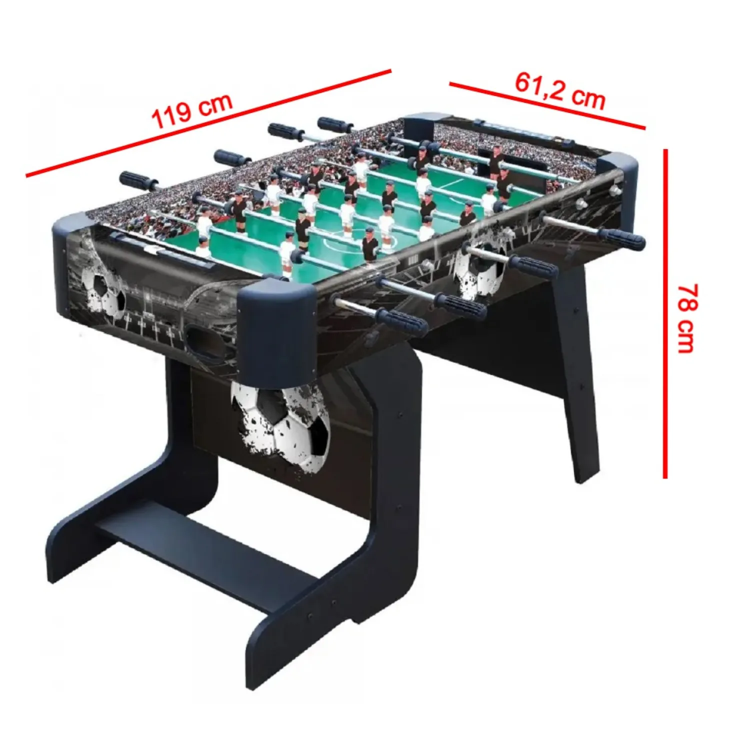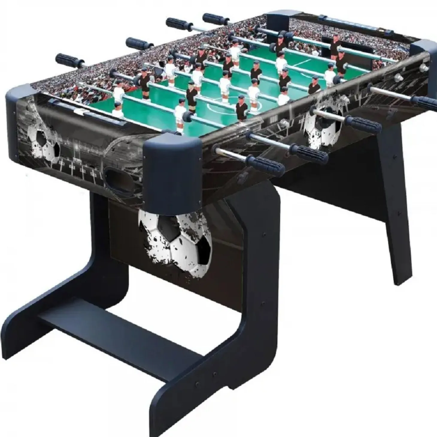 Futbolín con sistema de plegado para guardarlo de manera fácil y sencilla pudiéndolo dejar en cualquier habitación ocupando poco espacio. Formado por 22 jugadores, 11 de ellos vestidos de color blanco, y los otros 11 restantes visten de color negro. Cuenta con 2 marcadores manuales para poder apuntar de mejor manera los goles. Las barras de los jugadores están fabricadas con acero cromado mejorando su resistencia, junto con un sistema que evita que la barra salga por el lado contrario y así evitar posible golpes. Sus mangos son de plástico para mayor comodidad de uso.