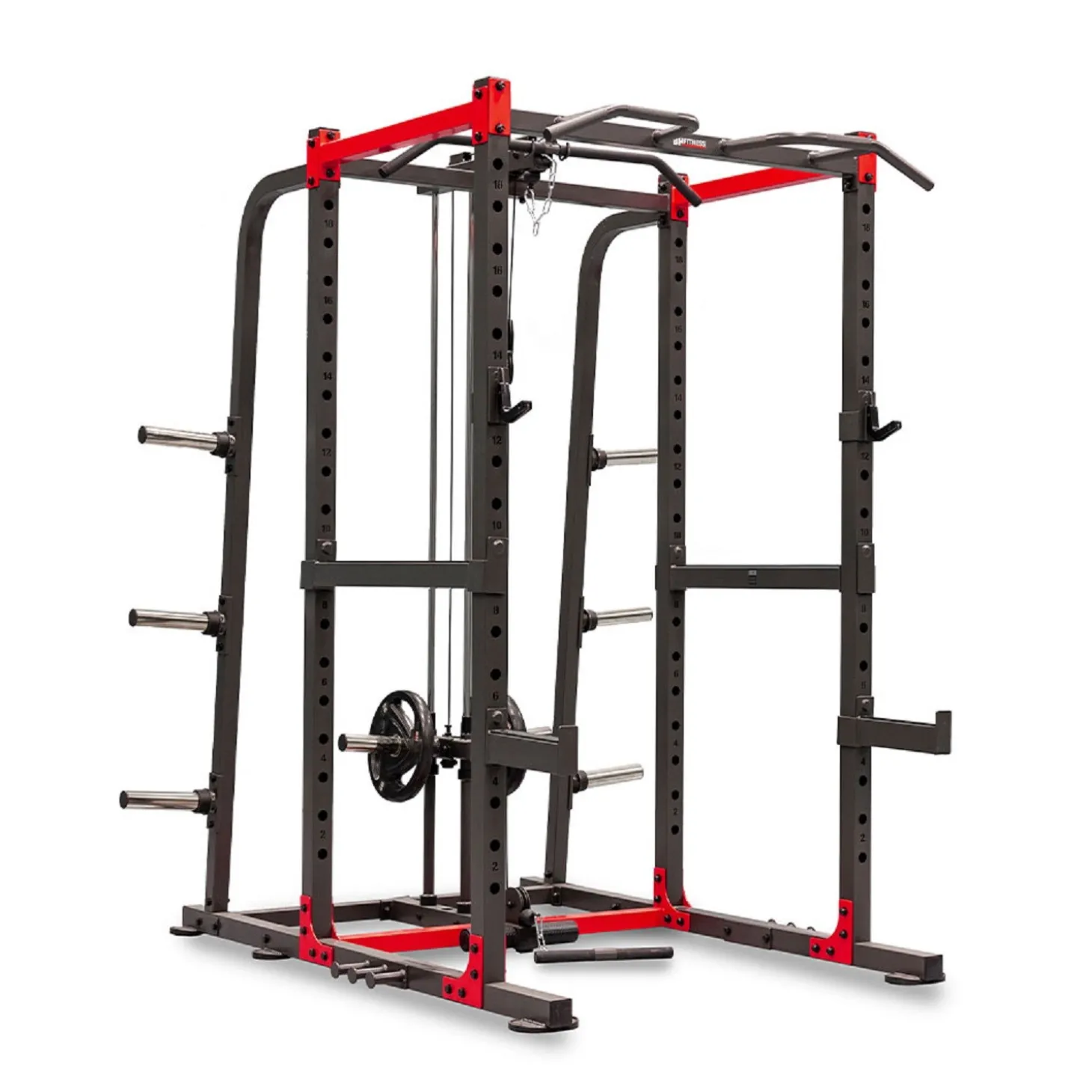 - Soportes de barra y seguridad: Incluye J-hooks y soportes para sentadilla ajustables a los diferentes puntos de altura de la jaula