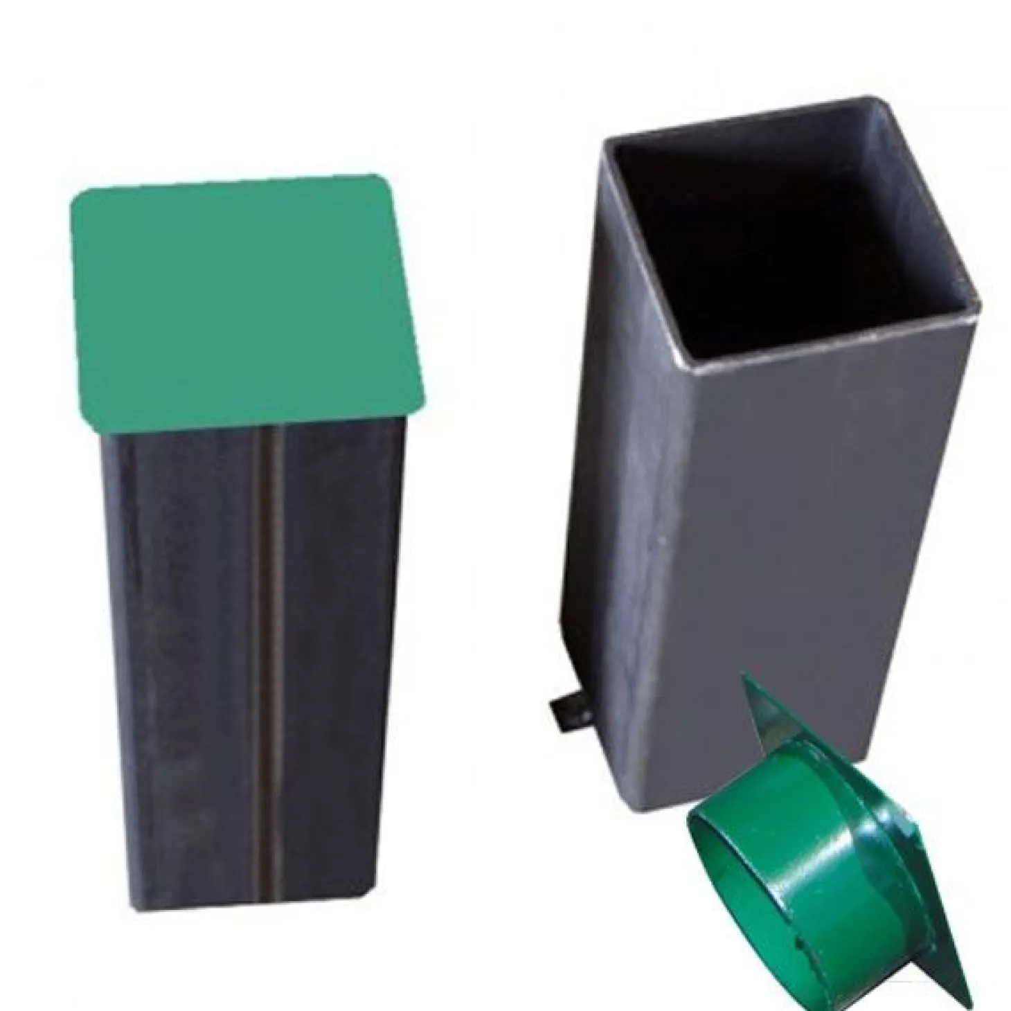 Juego de botes con tapa para postes de sección cuadrada de 80x80mm. Diseñados para empotrar en zapata de hormigón. Su uso es imprescindible para la colocación de cualquier poste metalico o de alumino fijo.