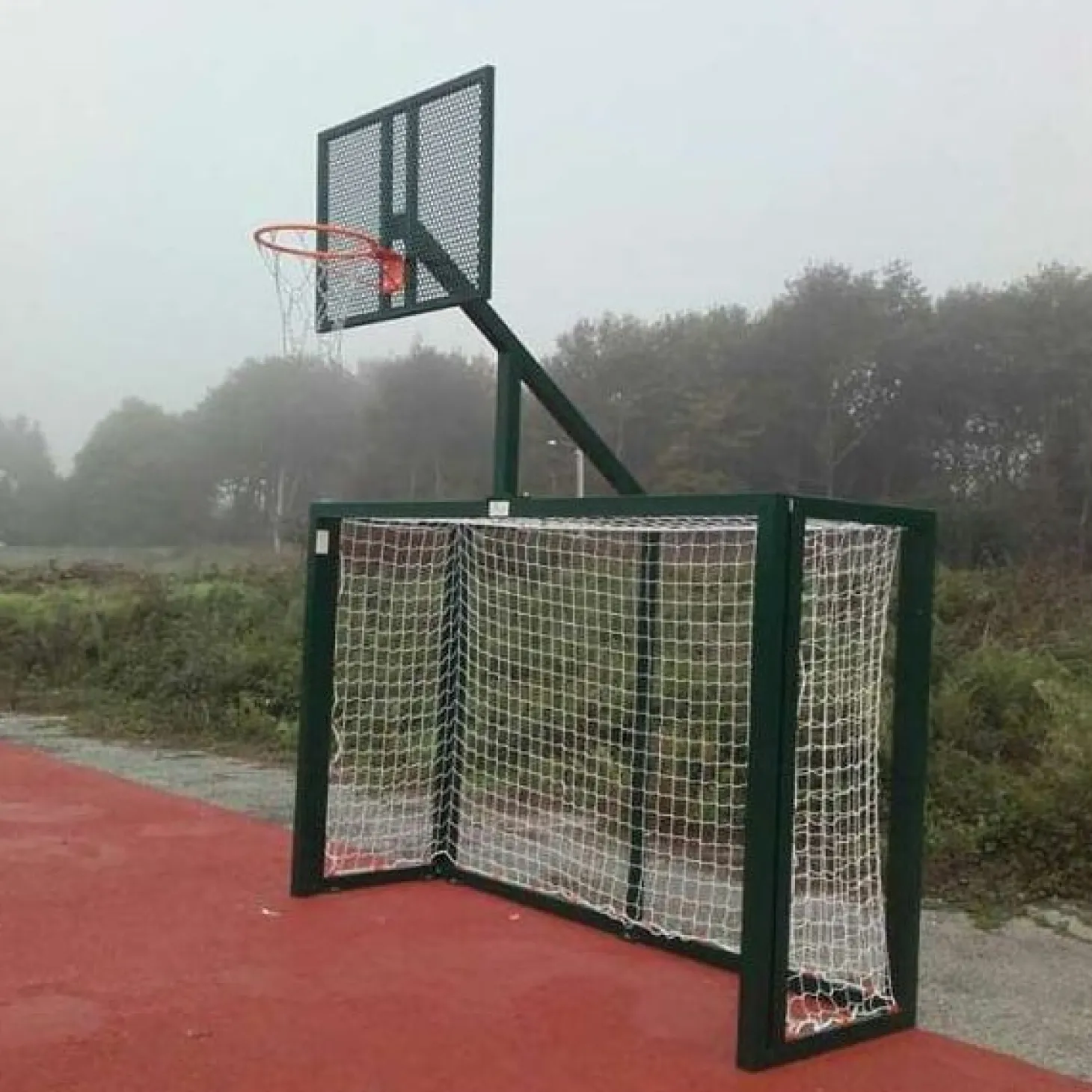 Juego de 2 porterías de fútbol sala / balonmano con canasta de baloncesto antivandálico con marco de acero exterior con sección de 80 x 80 mm.