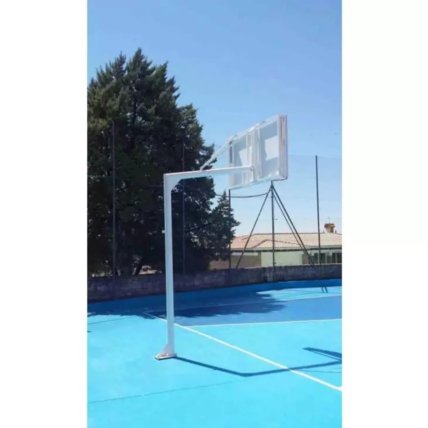 Juego postes de baloncesto fijos PRO de Ø114mm de grosor, con bases de anclaje incluidas y vuelo de 1 m.