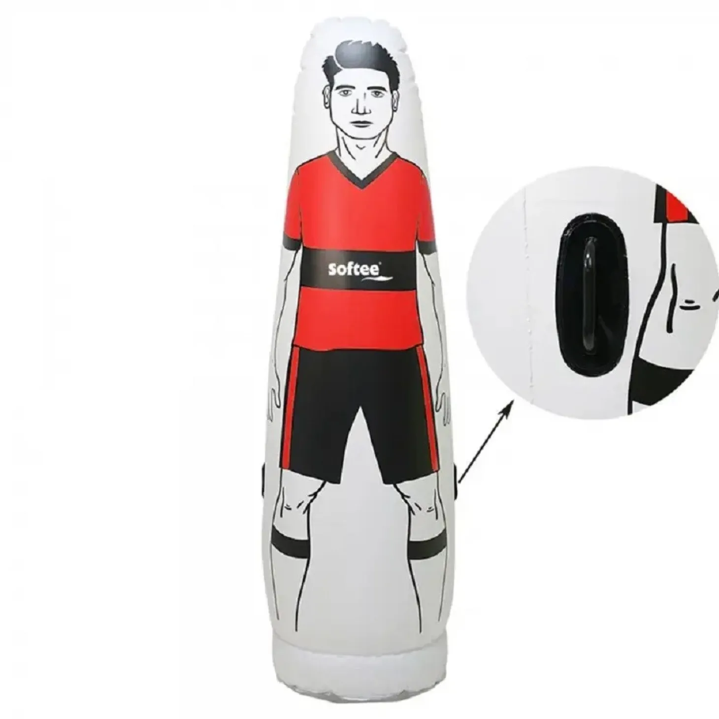 Fabricado en PVC de alta calidad que le proporciona una gran resistencia a los golpes, este jugador hinchable es perfecto para realizar trabajos de finalización o específico con porteros. Incluye dos asas laterales para moverlo fácilmente y dispone de un tapón en el cuerpo para su inflado y uno en la base para llenado y vaciado de agua. No incluye la bomba para inflarlo.