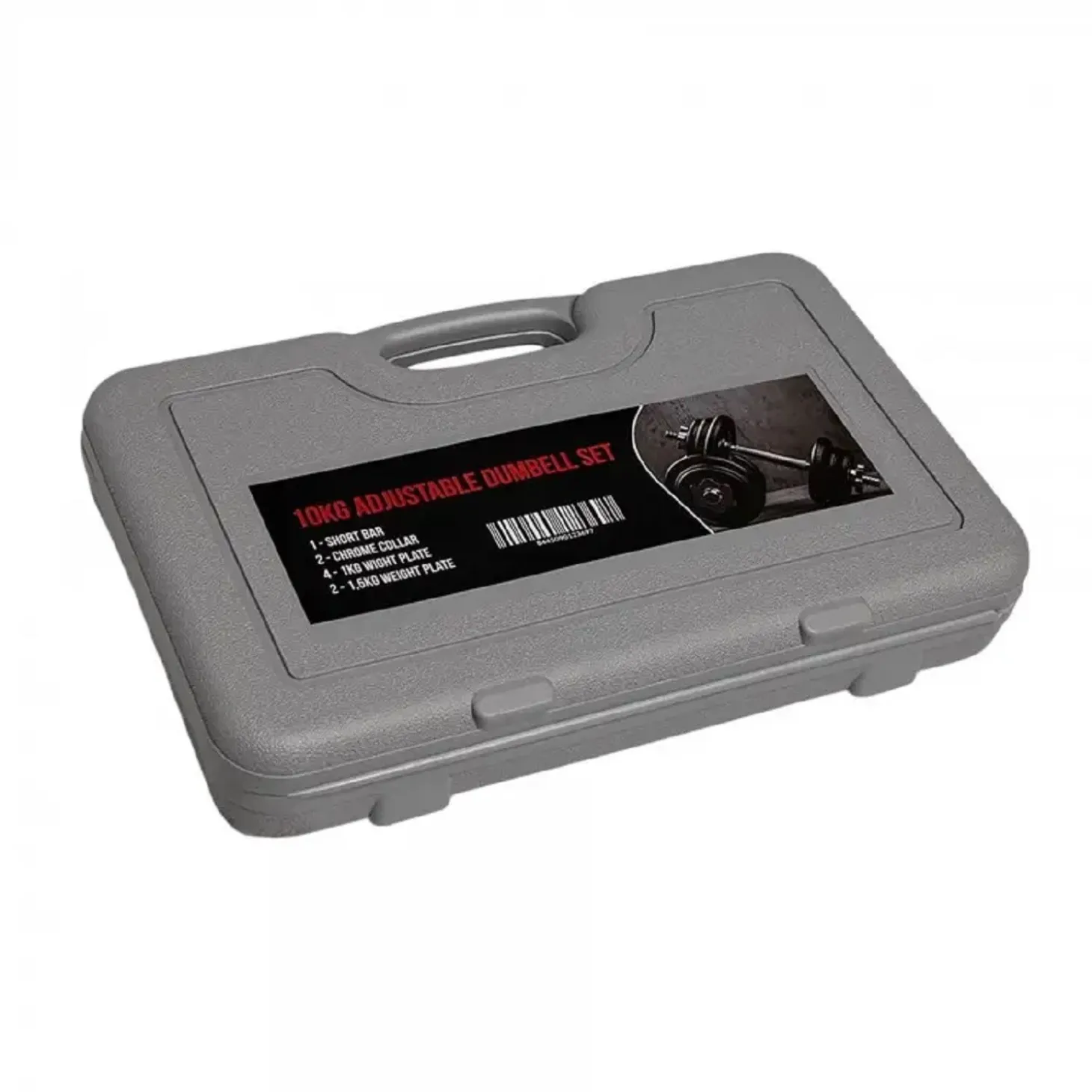 Kit de mancuerna ajustable de 10 kg, perfecto para entrenamientos en casa, al aire libre o en cualquier lugar. Incluye barra, discos intercambiables y maletín compacto para transporte.
