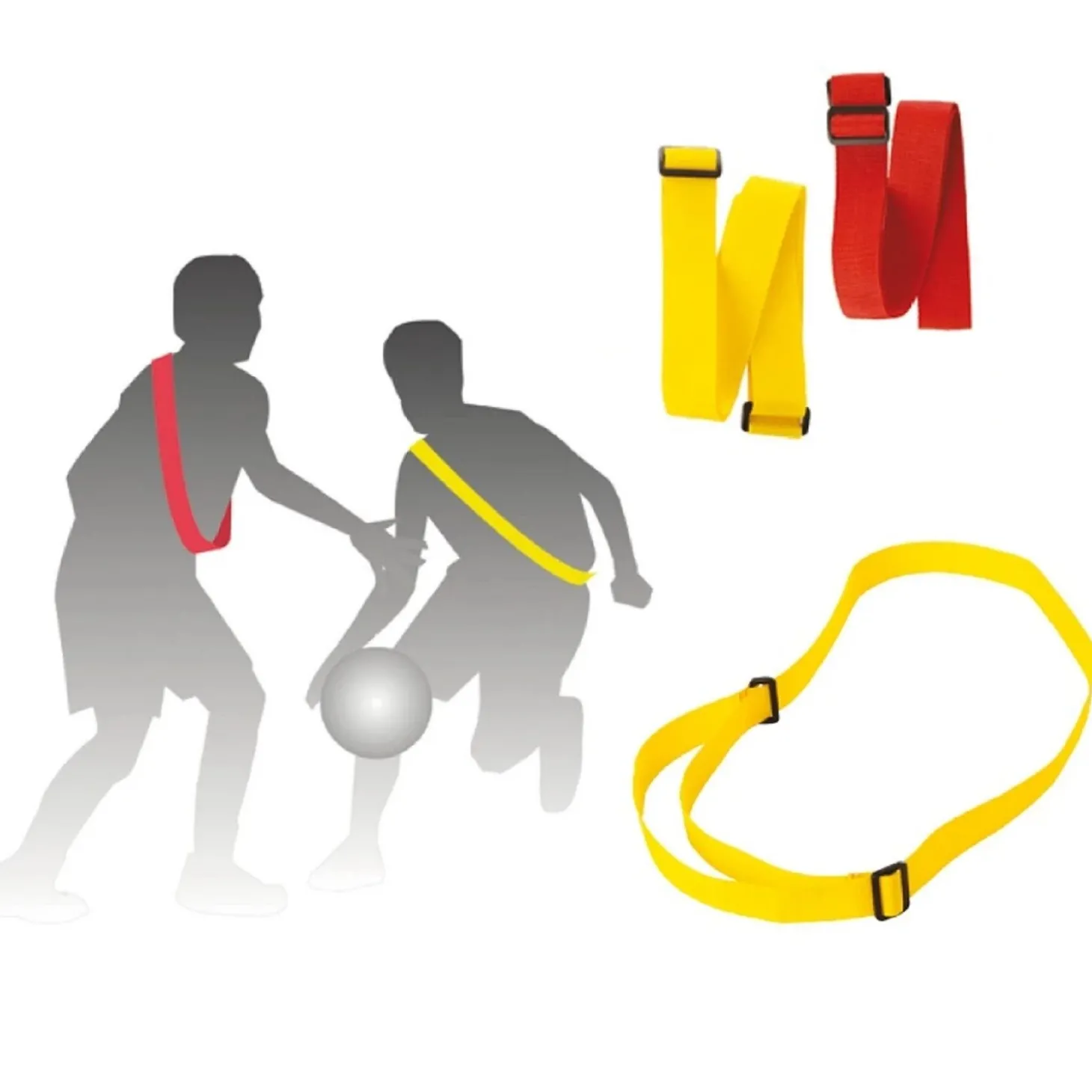 Lote de 10 tiras ajustables tipo peto, disponibles en amarillo o rojo, ideales para diferenciar equipos o grupos durante actividades deportivas y juegos.