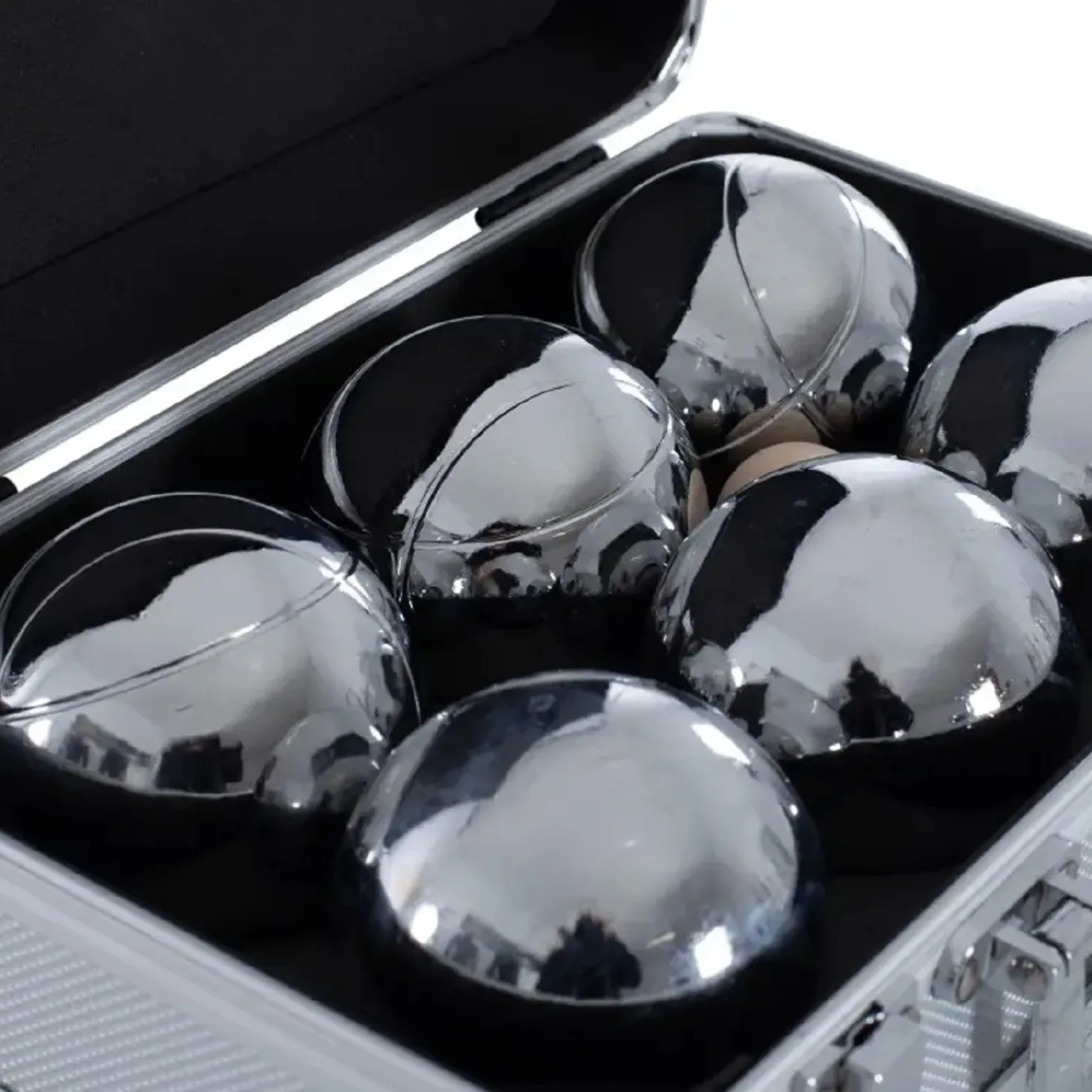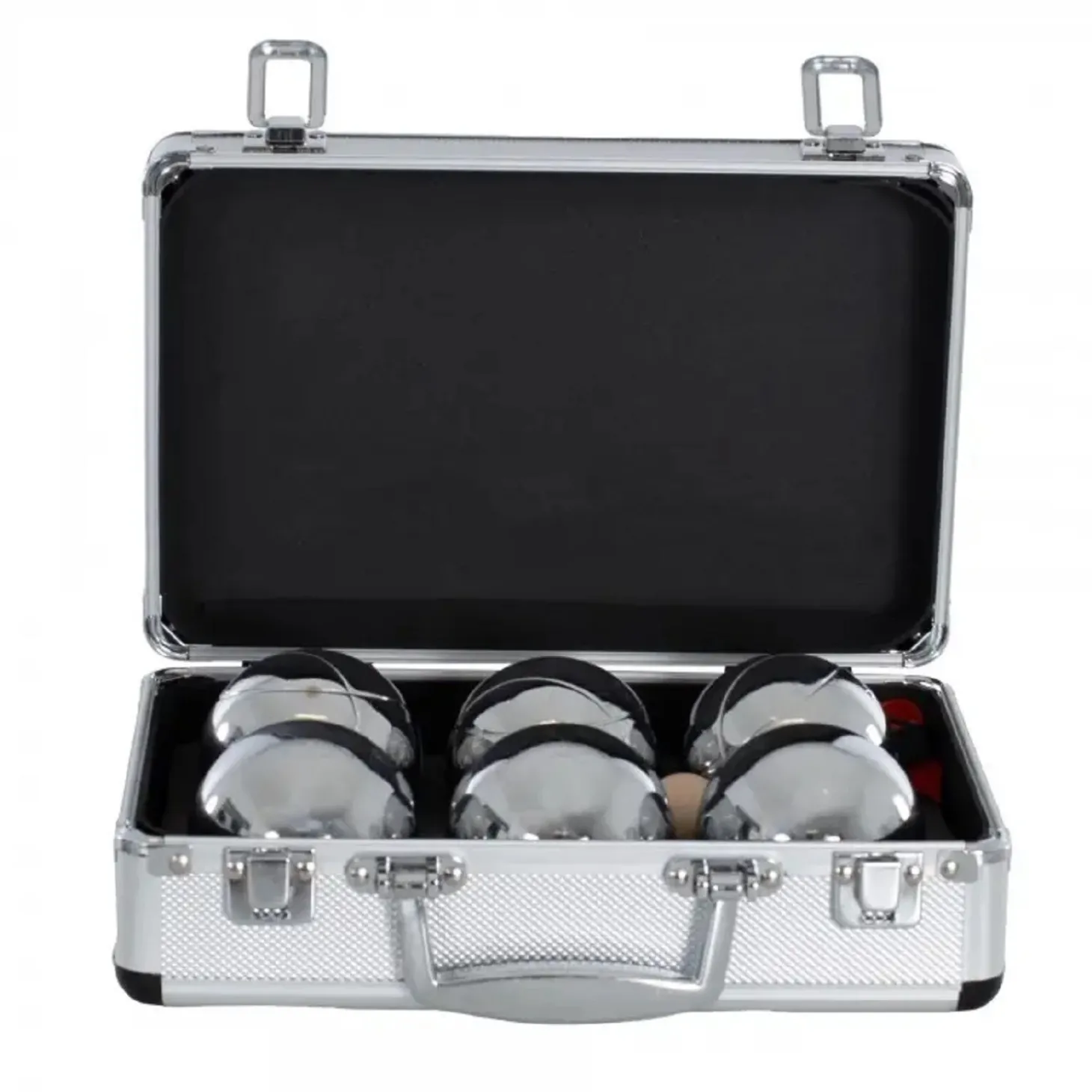 El maletín incluye dos juegos de bolas de petanca: tres bolas lisas y tres bolas con una línea grabada, lo que permite diferenciar fácilmente a los jugadores o equipos durante una partida. Este detalle es clave para mantener la fluidez del juego y evitar confusiones. Además, incorpora un boliche, el objetivo central del juego, para que puedas empezar a jugar de inmediato. Cada bola está fabricada en acero cromado, con un diámetro aproximado de 7 centímetros y un peso de 700 gramos. Este material garantiza durabilidad, resistencia al desgaste y un excelente agarre. Las bolas tienen un tacto cómodo que favorece lanzamientos precisos, tanto en superficies lisas como en terrenos más irregulares. El conjunto viene presentado en un maletín metálico de 27x20x10cm, lo que facilita enormemente su almacenaje y transporte. Su estructura resistente protege las bolas de golpes y arañazos, y su asa ergonómica permite llevarlo fácilmente a cualquier lugar: al parque, la playa, el campo o el jardín.