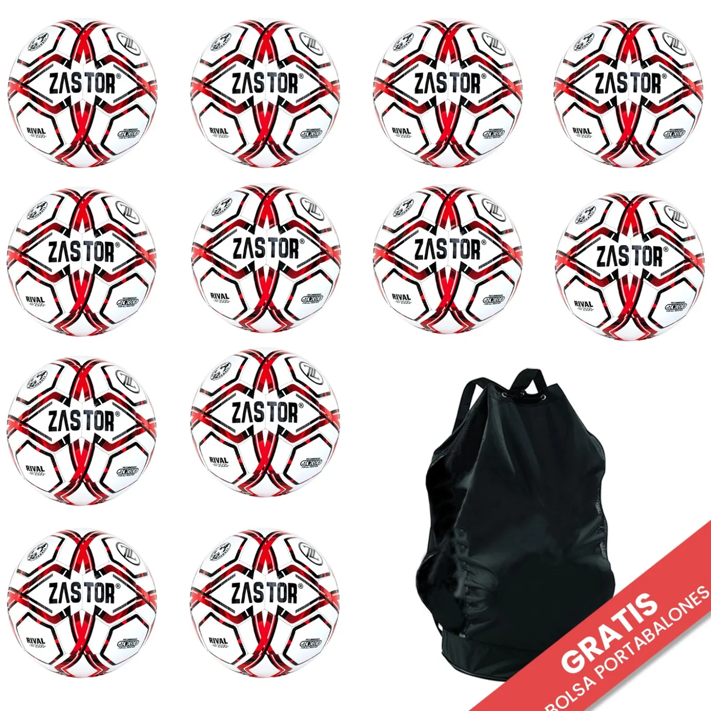 El pack de 12 balones Zastor Rival Red en talla 4 es perfecto para entrenamientos y competiciones en escuelas y clubes deportivos. Incluye bolsa portabalones gratuita.