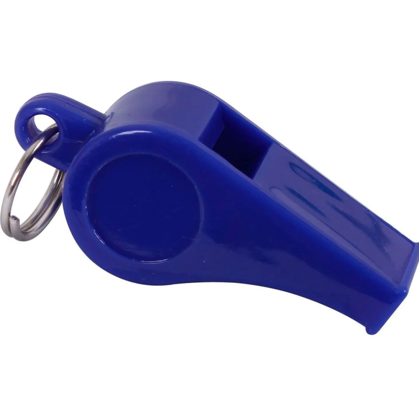 Caja de silbatos de plástico de color azul con anilla.