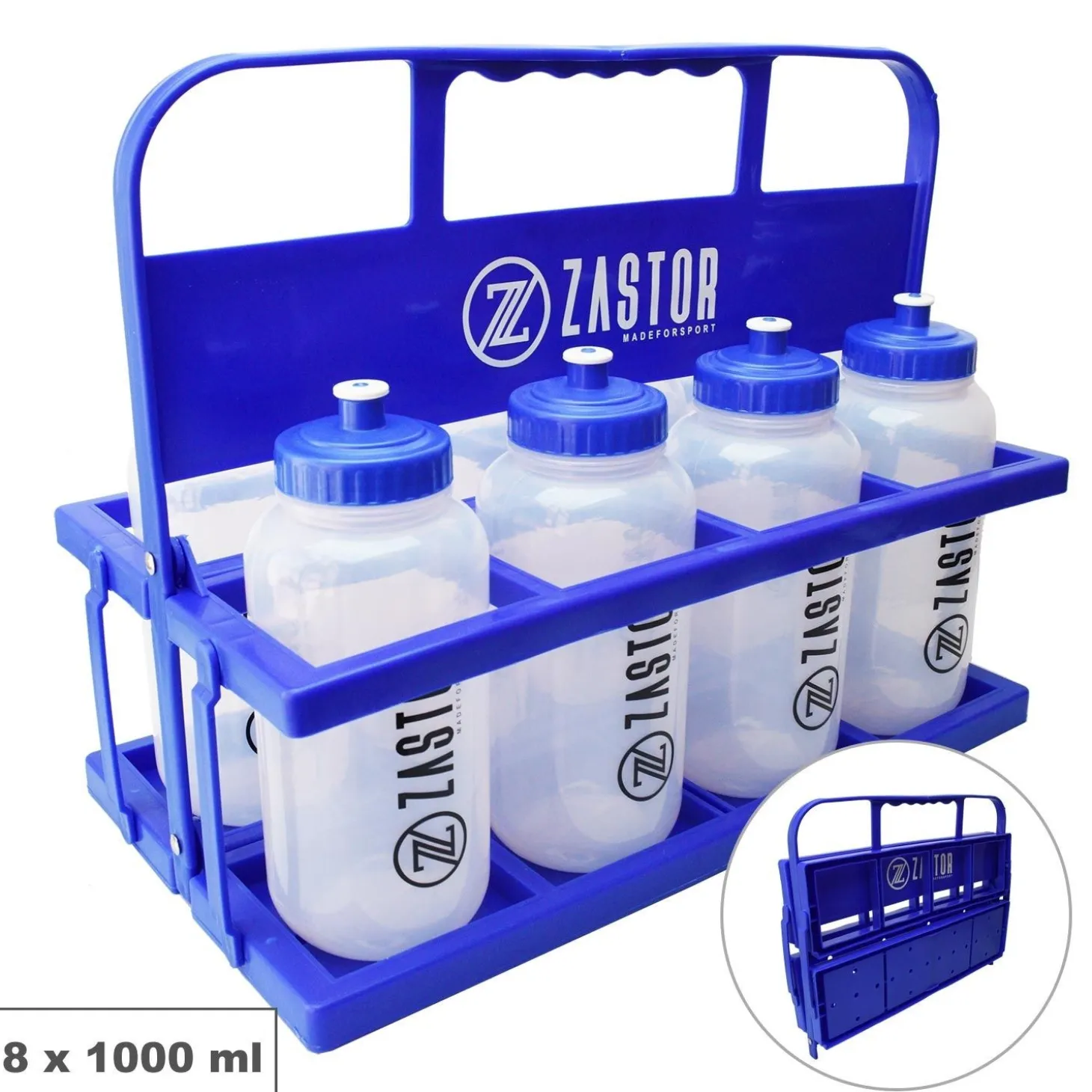 Pack 8 botellas de 1 litro con botellero plegable en color azul.