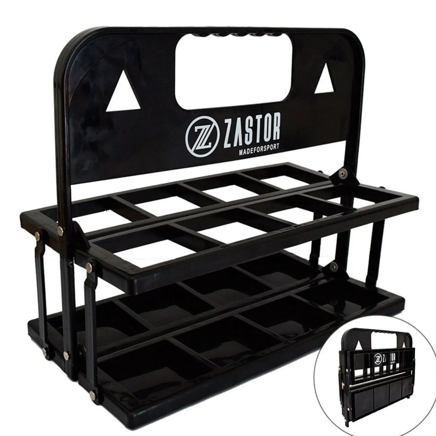 Botellero plegable de color negro con 8 botellas para avituallamiento de 750 ml blancas con tapón PET.