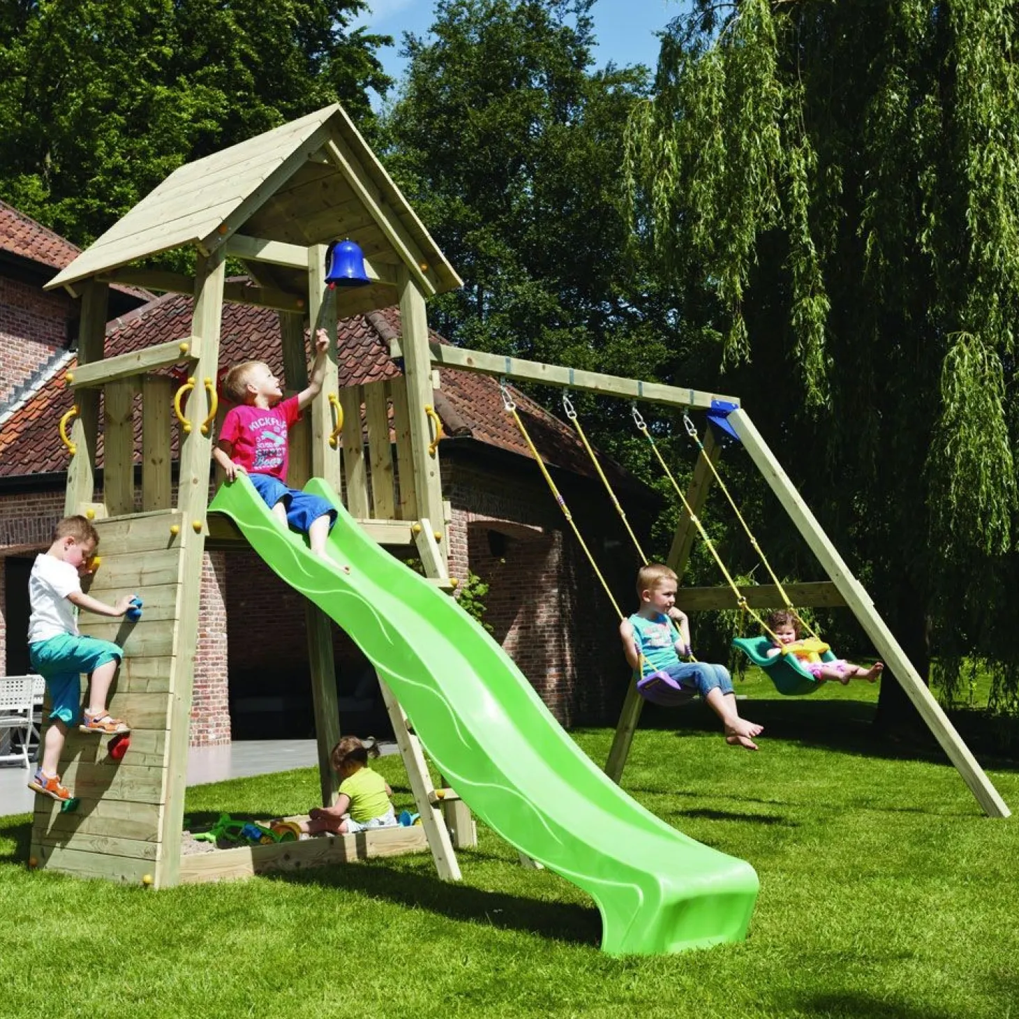 ¿Buscas un parque infantil multiaventura para el disfrute de tus hijos en el jardín de casa? La Torre Belvedere con Columpio es perfecta para que estén entretenidos durante horas y jugando con multitud de actividades.
