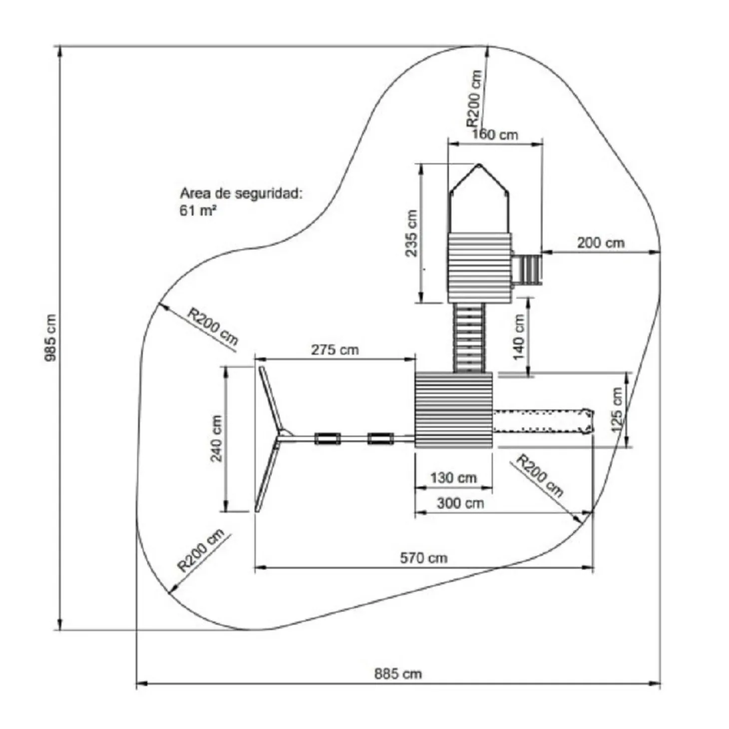 Este parque infantil Pacific L tiene las siguientes medidas: 615x570x275cm (largo x ancho x alto). La estructura de la plataforma es de 1’20m y la rampa del tobogán es de 2’32m de largo, cuyos postes principales que aguantan la estructura tienen una medida de 68x68mm con una altura de 240cm. Se recomienda dejar 2 metros alrededor del parque de zona de seguridad.