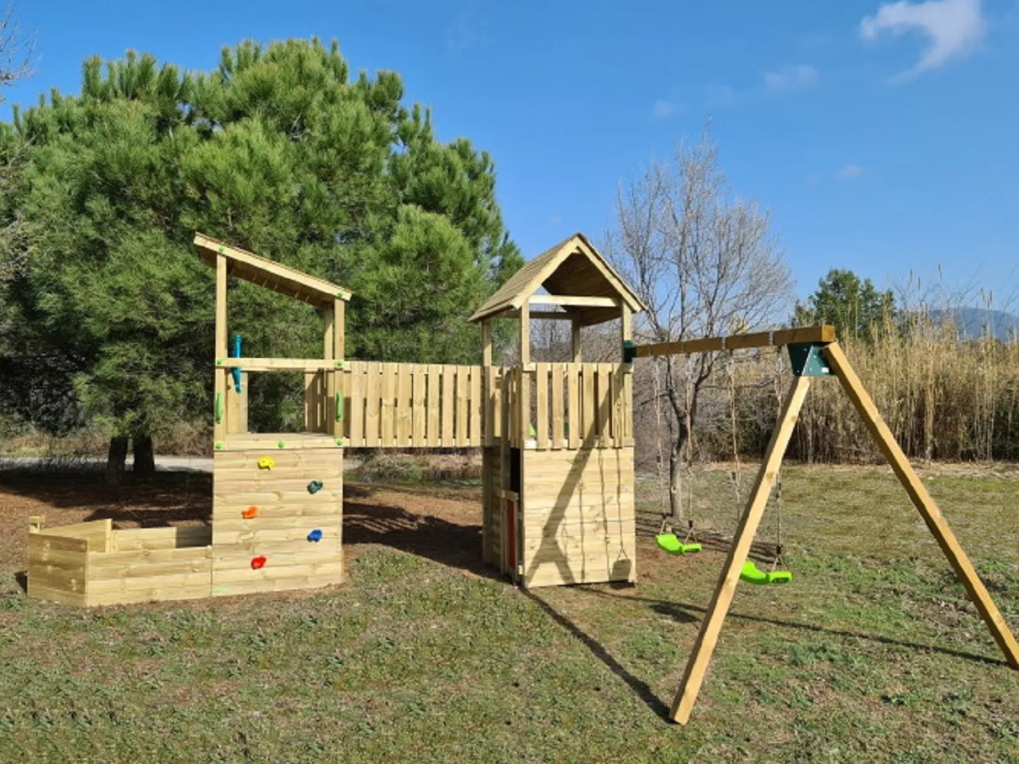 El parque infantil Pacific L con columpio doble es una espectacular estructura que combina dos torres (una de ellas con casita) conectadas por un puente elevado.