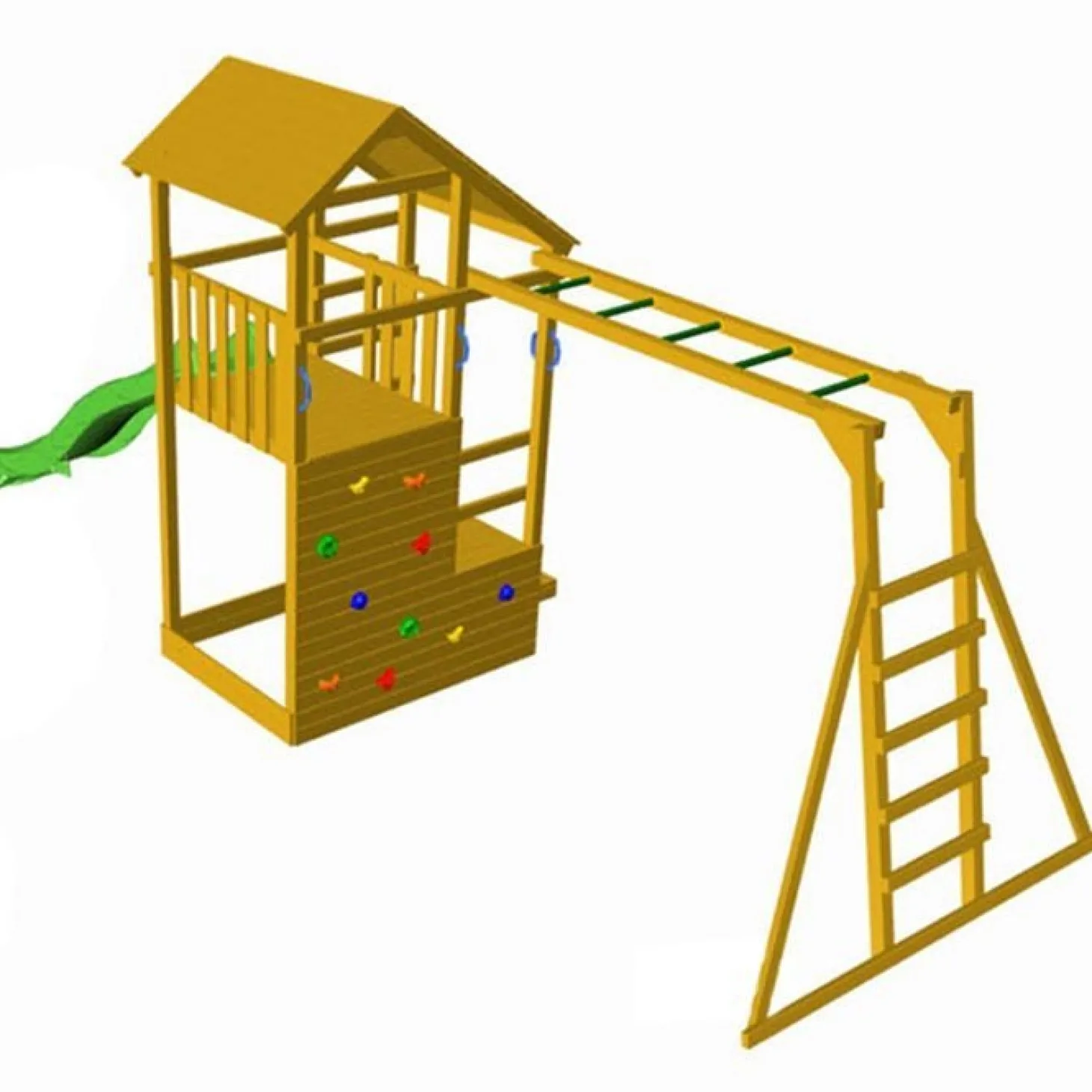 El Parque infantil Teide con escalera de mono es una torre de madera cuadrada, fuerte y resistente tratada para exterior para tener en el jardín de casa y asegurarte el disfrute de los más pequeños. Además incluye escalera de mono para que los más atrevidos puedan jugar y escalar sin límites. ¡Disfrutarán al máximo!