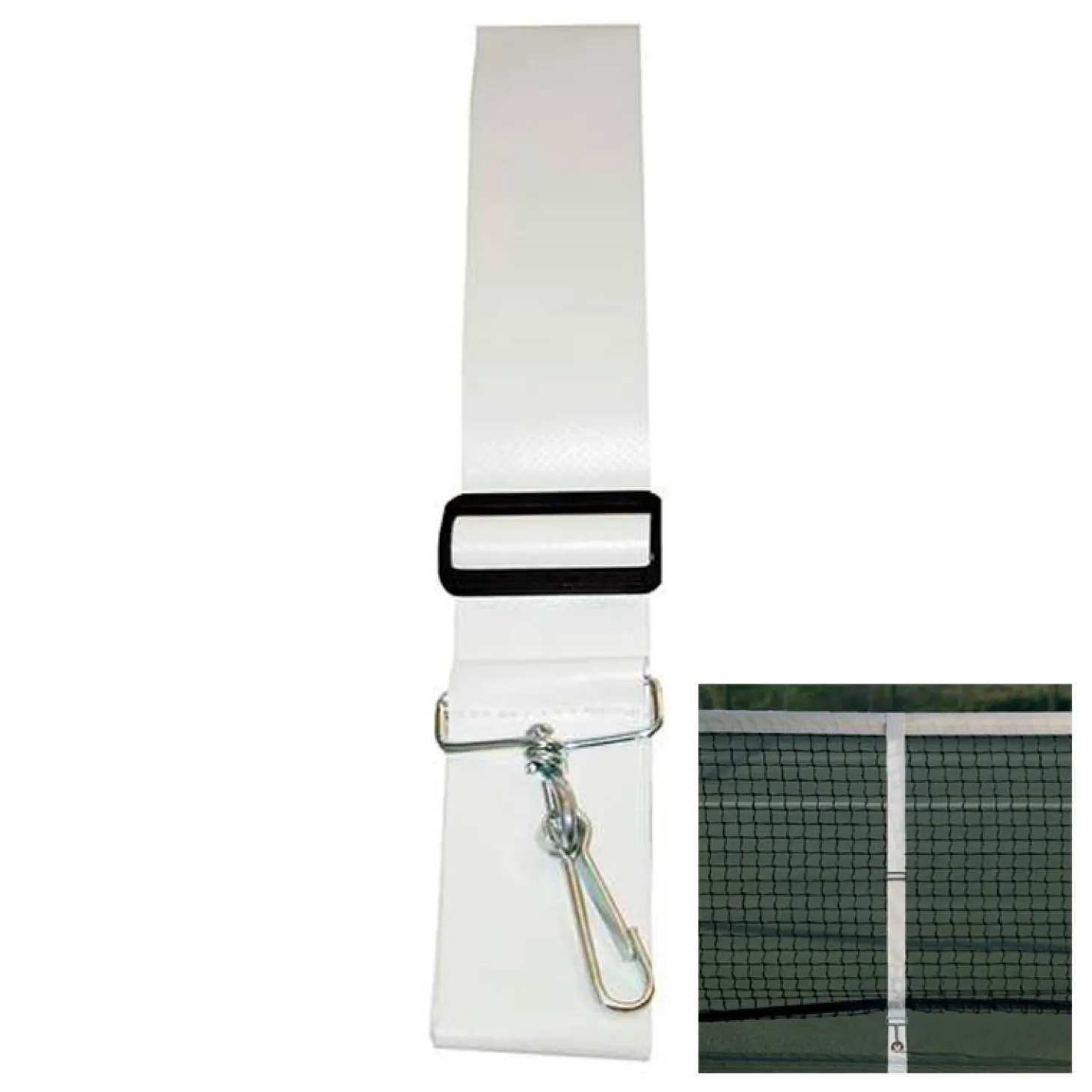 Regulador para redes de tenis que permite mantener la altura oficial en todo momento. Fabricado en cinta de PVC de 50mm. Incluye hebilla y mosquetón.