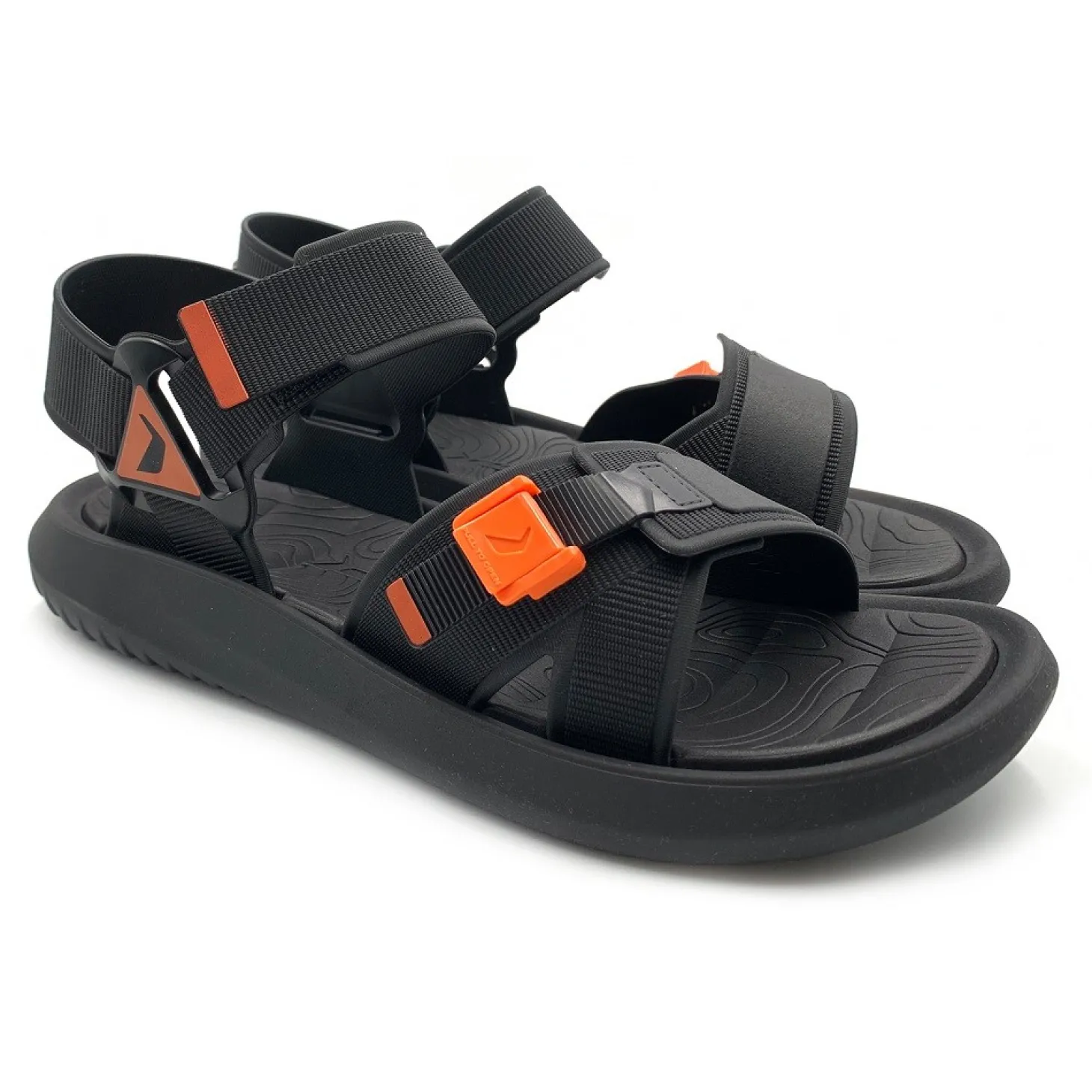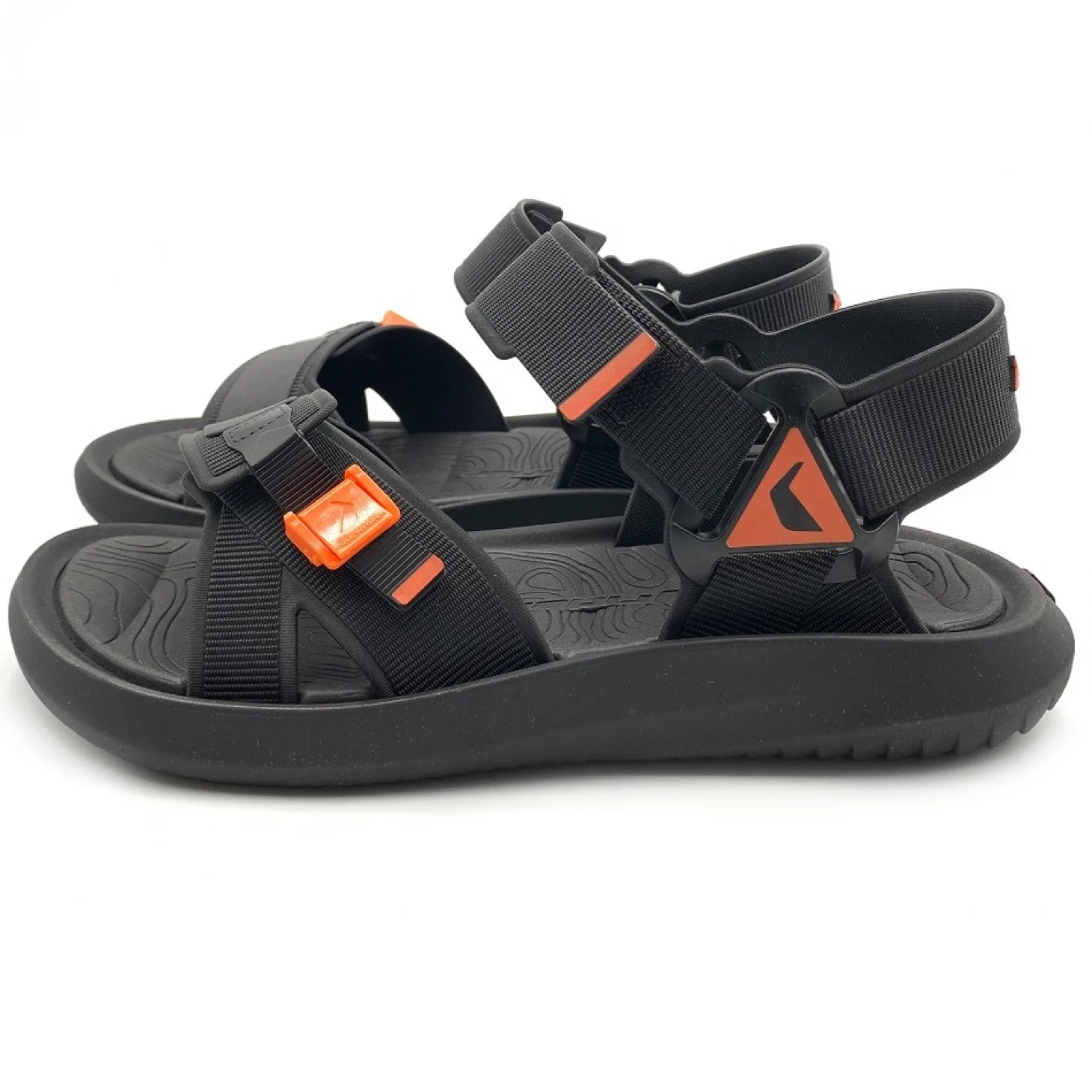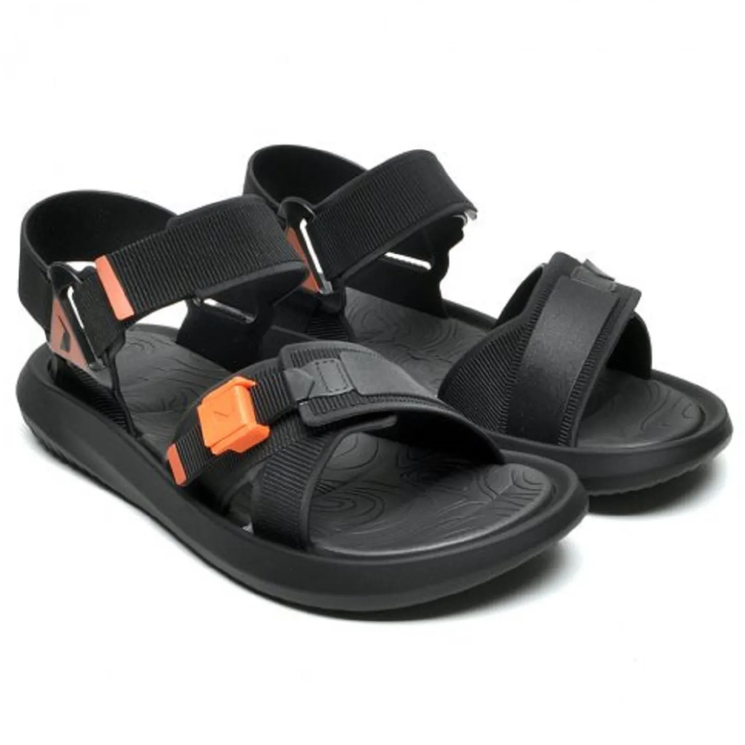 Hazte con estas chanclas para hombre, tipo trekking en color negro y naranja, perfectas para caminar por ríos o zonas humedad, además de poder usarlas diariamente.