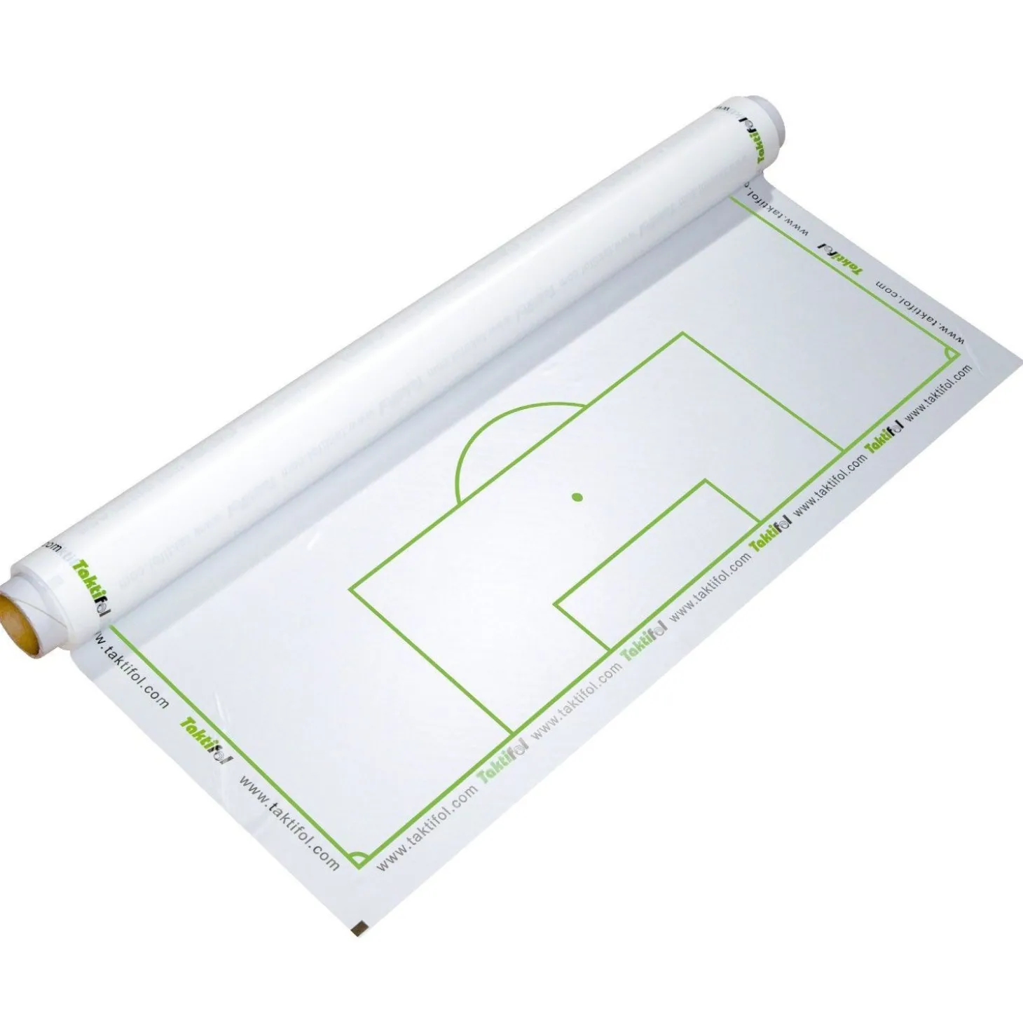 Rollo con 25 láminas Taktifol de campo de fútbol. Tienen carga electrostática por lo que se adhieren en múltiples superficies y se despegan sin dejar rastro. Permiten escribir y borrar fácilmente con rotuladores tipo Velleda.