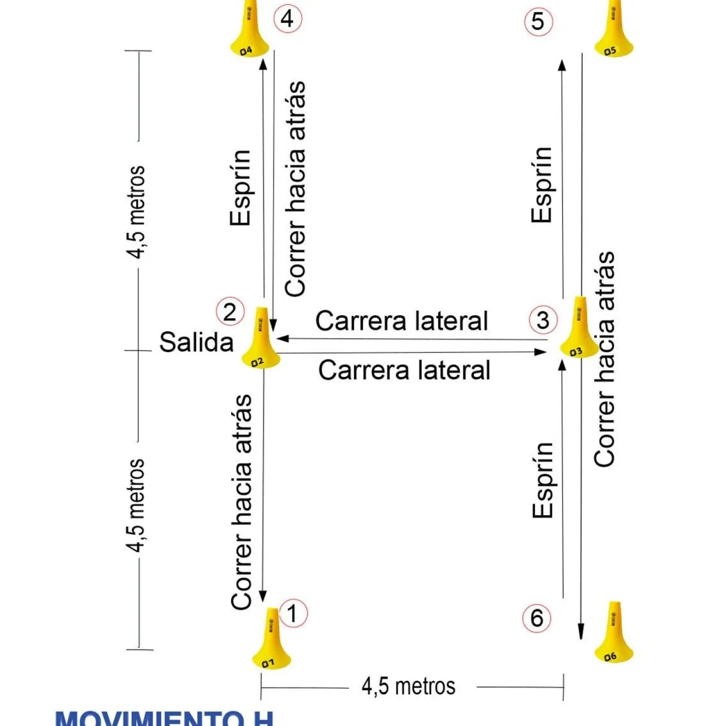 A continuación se avanza desde el 3 hasta el número 6; y luego hacia atrás del 6 al 3. Nueva carrera lateral del 3 al 2, y desde ahí y hacia atrás hasta regresar al cono número 1.