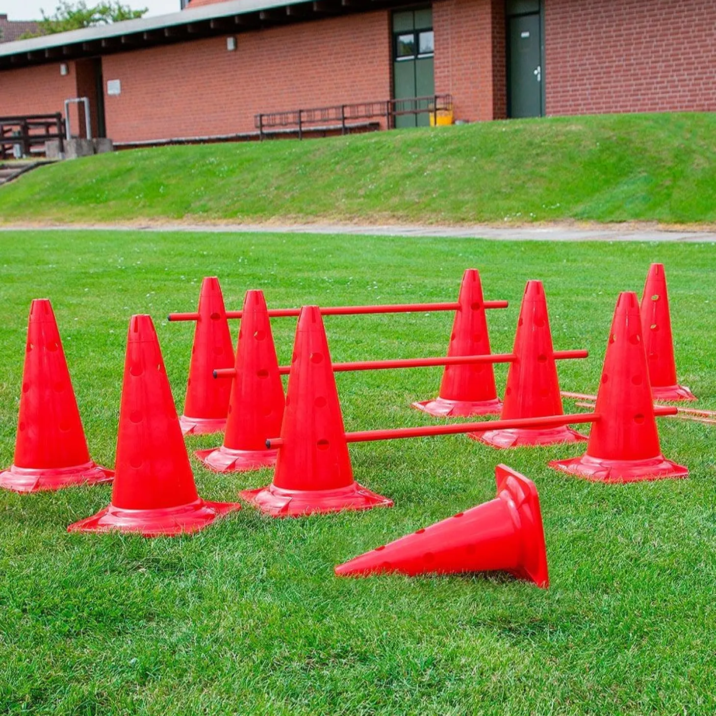 Set de picas y conos para entrenamiento deportivo. Compuesto por 10 conos de 43 cm con doce agujeros y 5 picas de 1m de largo, para usar de forma individual o en conjunto.