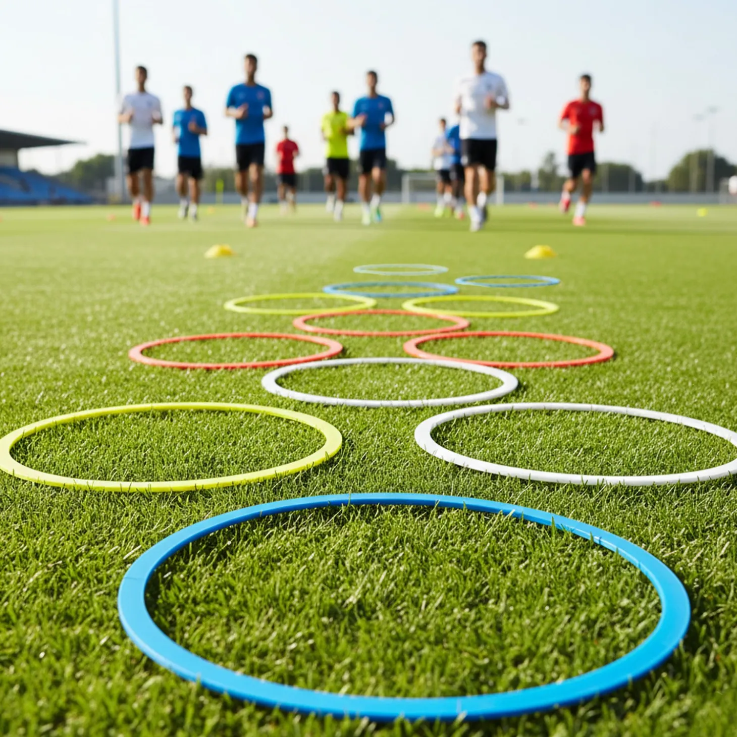 Set de 12 aros de entrenamiento extraplanos y flexibles, pensados para potenciar tus rutinas deportivas. Perfectos para ejercicios de agilidad, coordinación y velocidad, son una herramienta versátil tanto para entrenamientos individuales como en equipo.