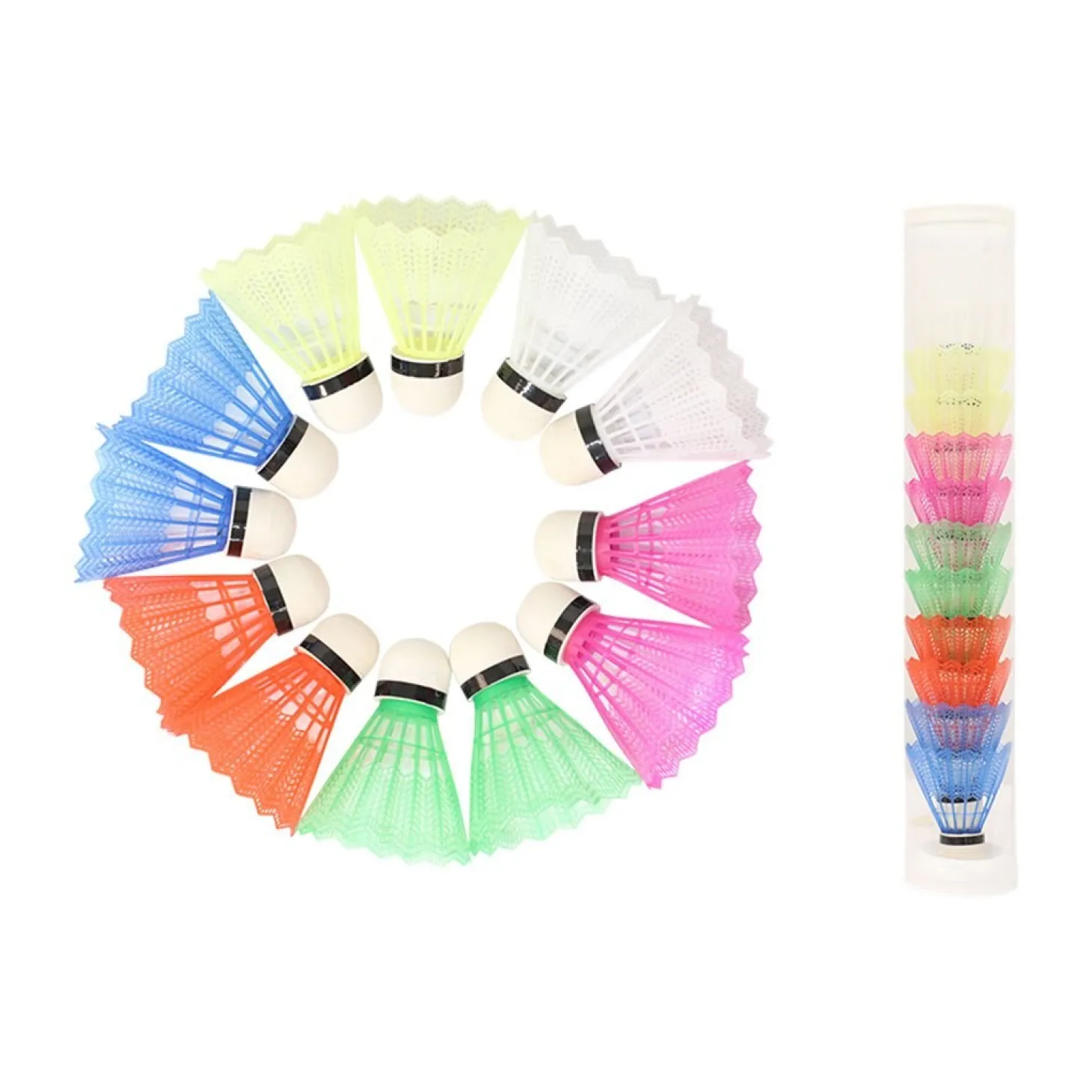 Set 12 volantes de bádminton en 6 colores. Uso indicado para iniciación.