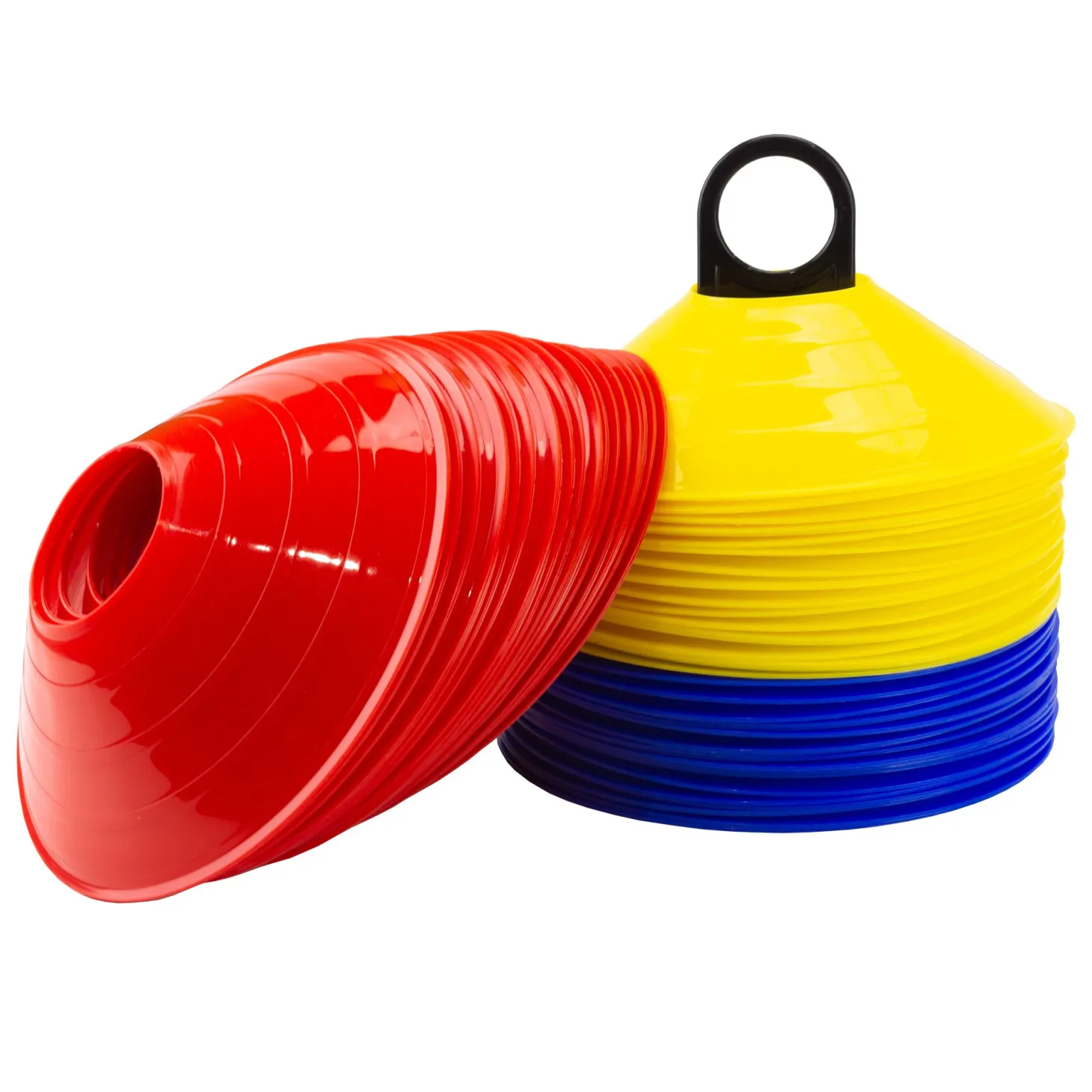 Set de 60 conos de entrenamiento flexibles, en color rojo, azul y amarillo, con soporte para su transporte y organización, perfecto para practicar tus tácticas y estrategias.