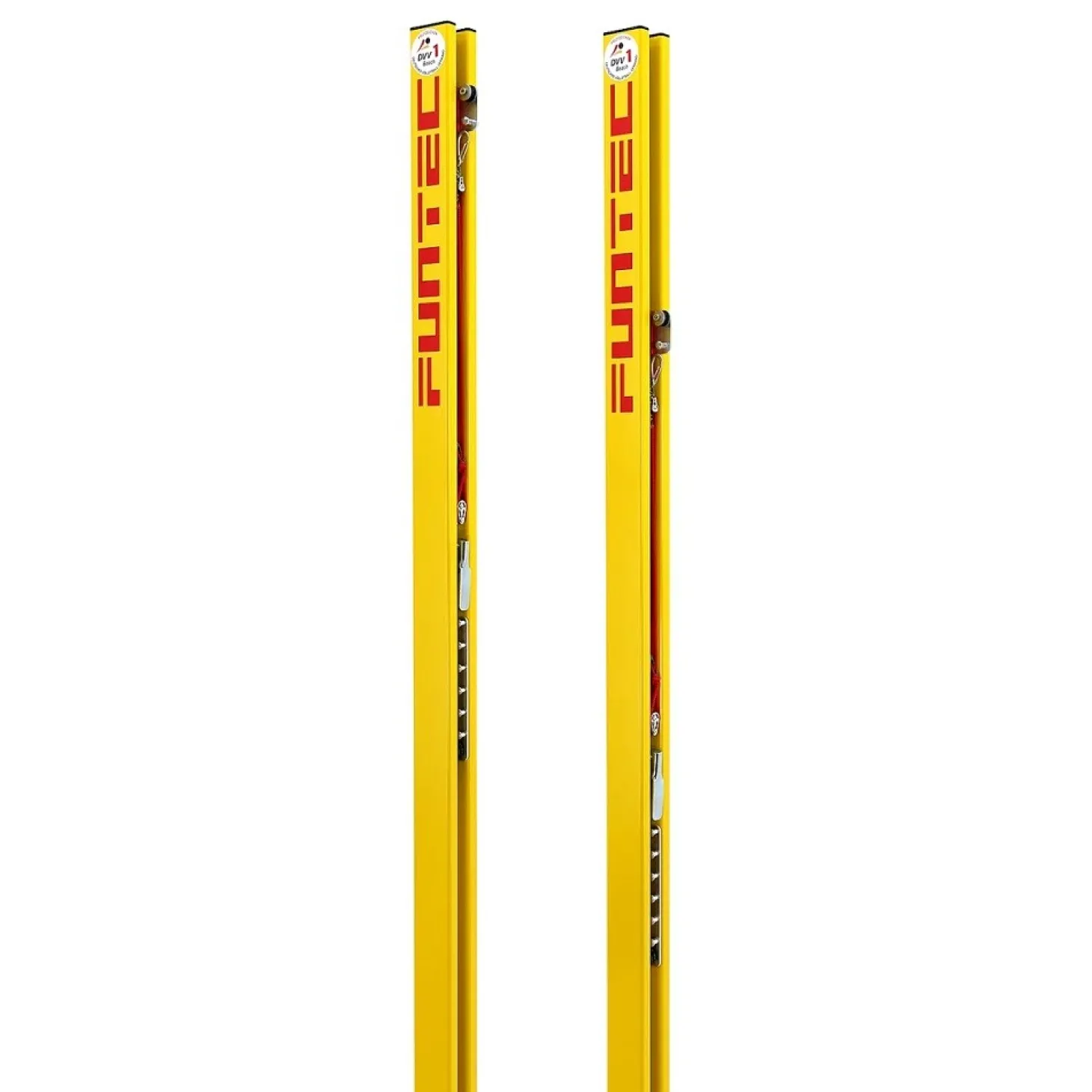 - 2 postes de red Beach Champ fabricados en aluminio con un perfil de 91x91mm, recubiertos con polvo amarillo y certificados con la marca de prueba DVV1.