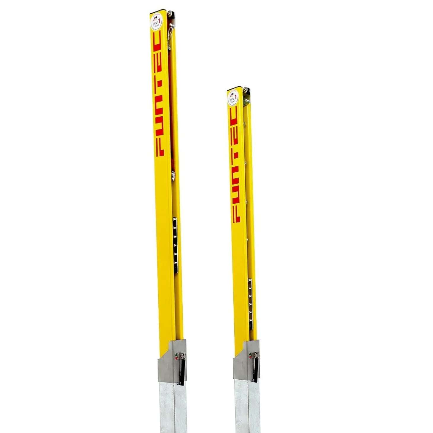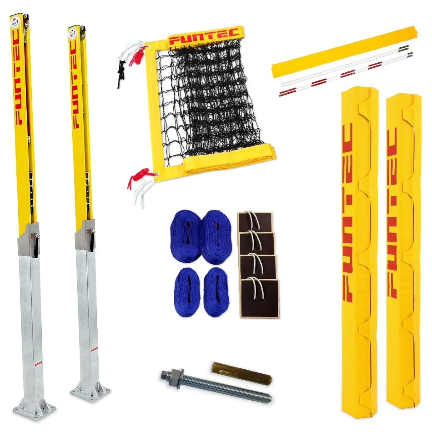 - 2 postes de red Pro Beach que incluyen tomas de tierra para instalar utilizando dados de cimentación enterrados en la arena. Son postes telescópicos de aluminio de sección cuadrada de 91mm, recubiertos con polvo amarillo y con marca de verificación DVV1.