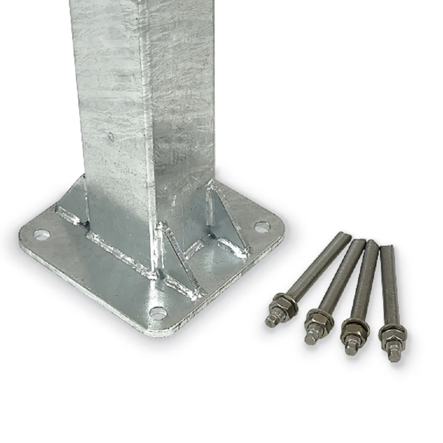 - 8 anclajes y casquillos extrafuertes para atornillar a la base de los postes, fabricados en acero inoxidable VA4 con rosca M16.