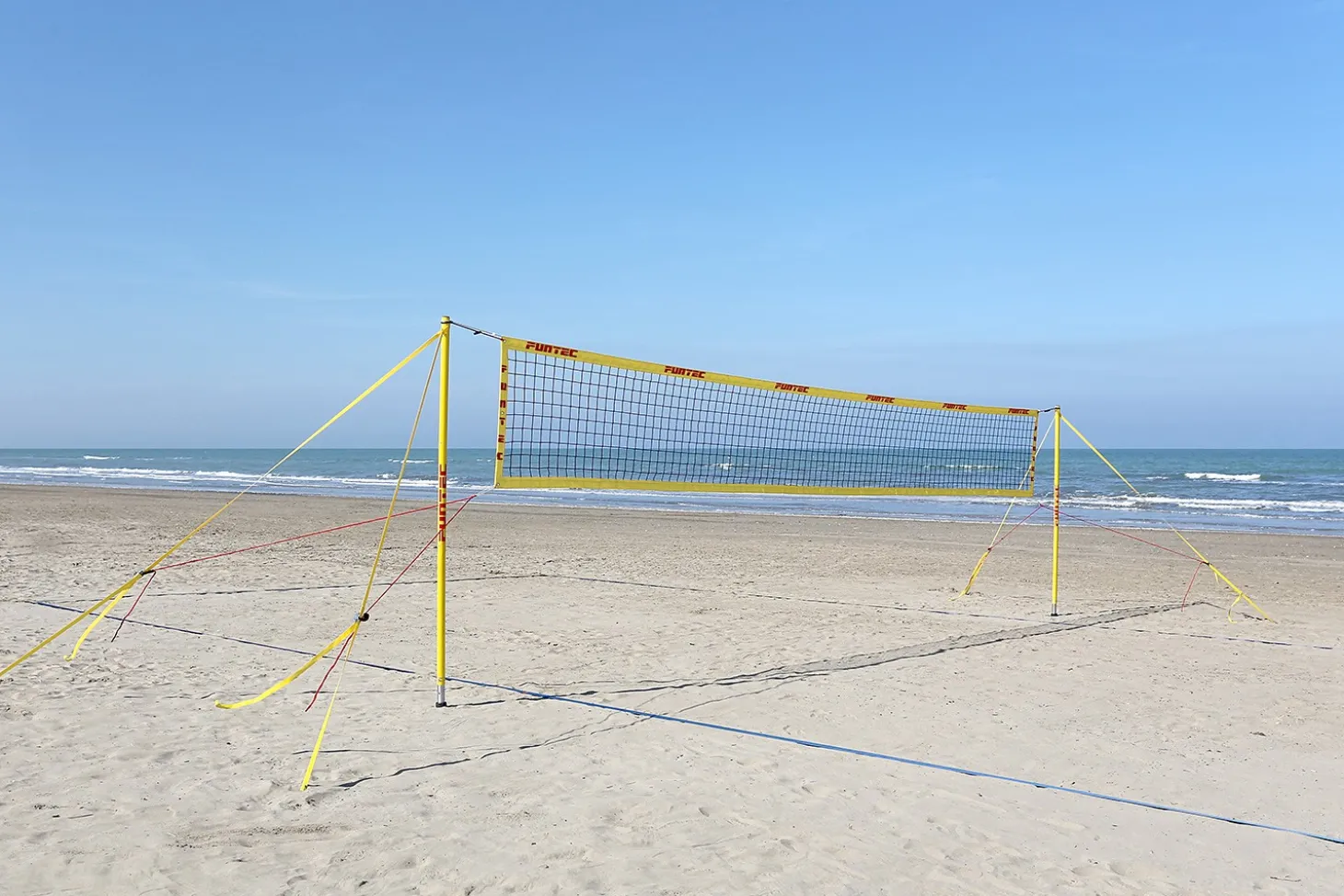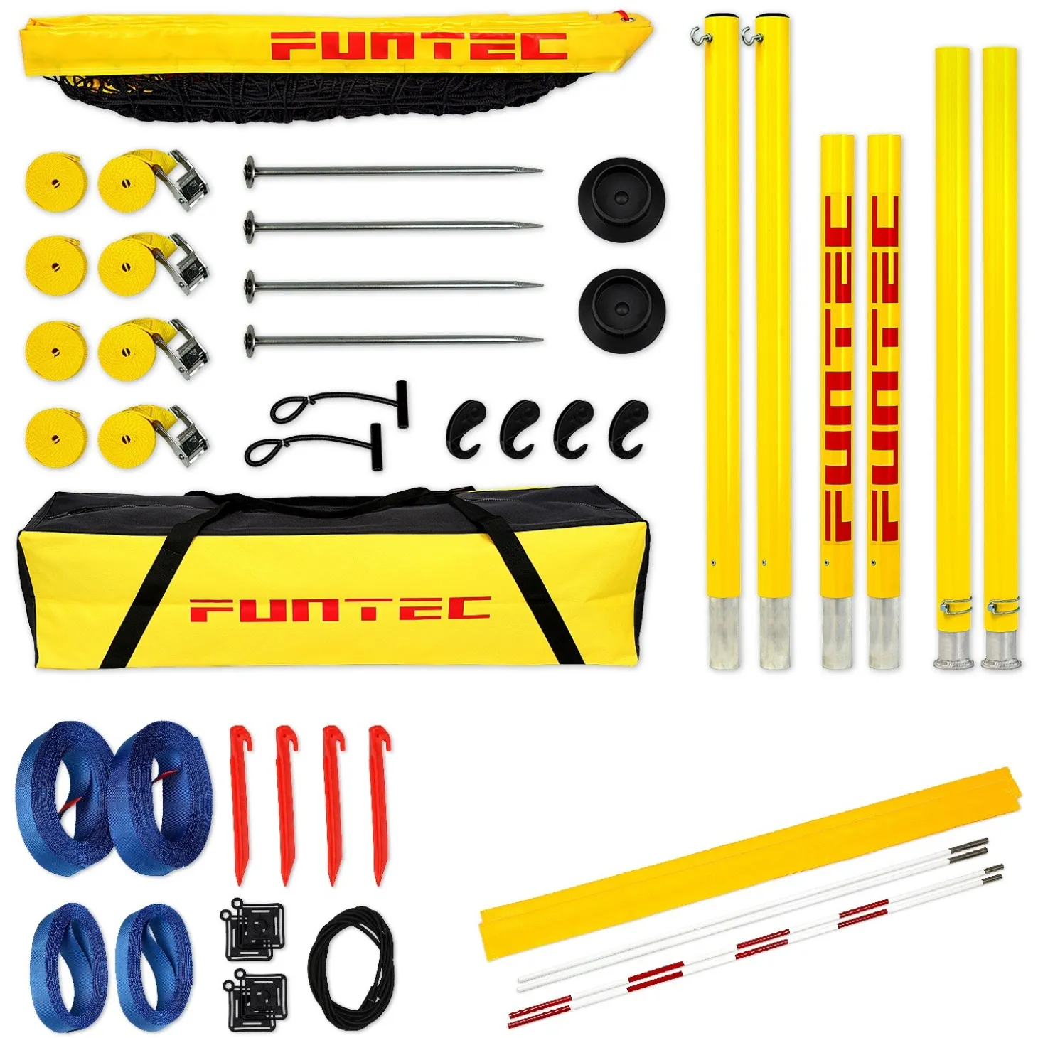 Set de vóley playa de la marca líder Funtec, el Pro Beach Bundle, totalmente transportable y resistente, pensado para jugadores y equipos profesionales. Incluye cintas delimitadoras de campo y antenas para la red.