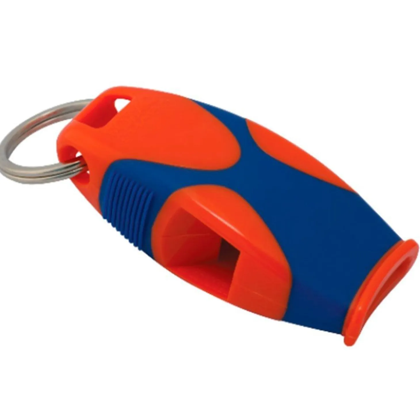 Silbato concebido específicamente para su uso en el exterior. Tiene una gran potencia de sonido y funciona a la perfección tanto en seco como en húmedo. Color azul/rojo. Incluye cordón.