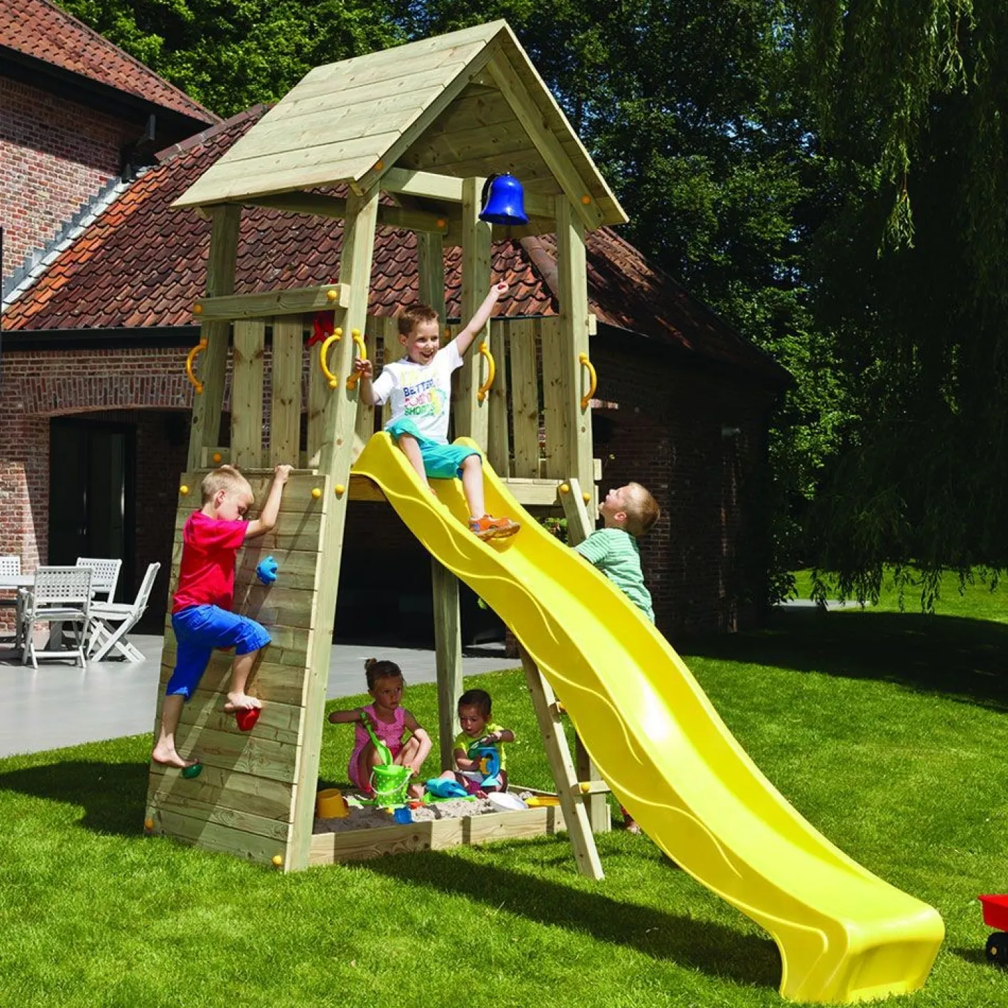 ¿Tienes un jardín en casa y quieres un parque infantil para que tus hijos se diviertan? La de madera Torre Belvedere es perfecta para asegurar horas de diversión a los más pequeños de la casa. ¡Tiene tobogán, escalera y rampa de escalada!