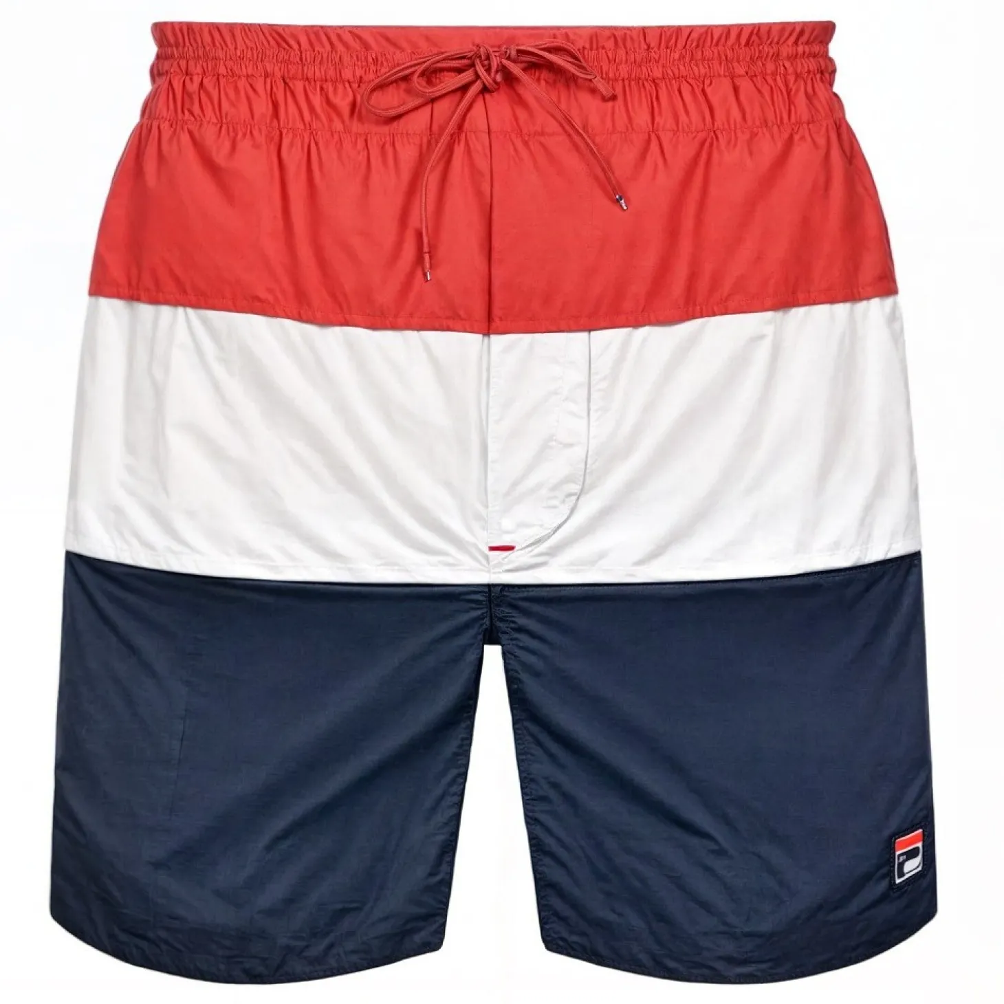 Con un diseño atractivo y llamativo, este bañador de Fila en color azul marino, blanco y rojo favorece la libertad de movimientos, permitiéndote moverte con facilidad dentro y fuera del agua. Trae cintura elástica con cordón, adaptable a cualquier contorno, y dos bolsillos laterales para guardar tus objetos personales en ellos. Cómodo y suave, este bañador de Fila es el aliado perfecto para la playa y la piscina.