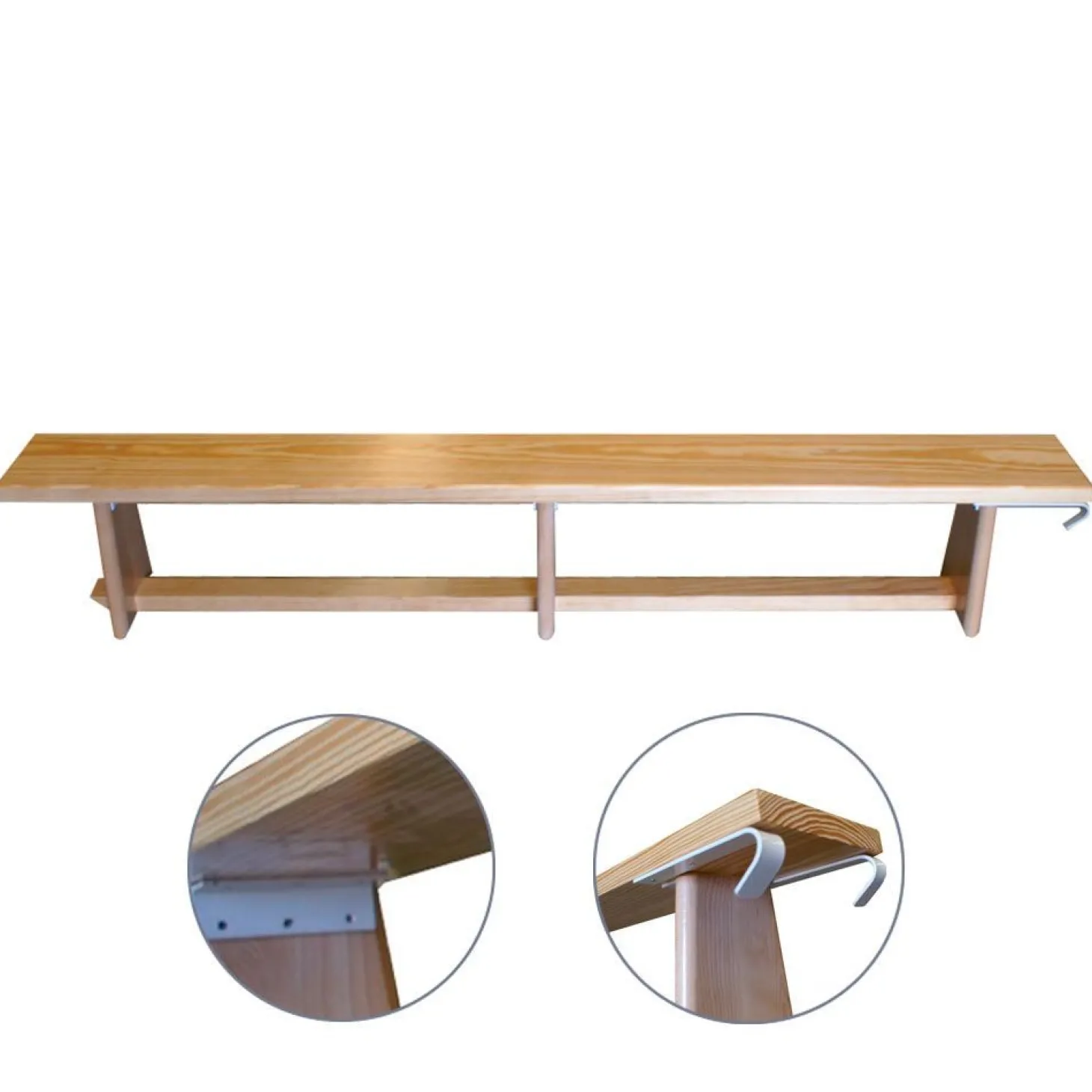 La parte superior ha sido fabricada en madera de pino melis y las patas en madera de haya, reforzadas con piezas metálicas con ganchos de sujeción a espaldera. Todas las patas disponen de piezas de goma antideslizante. Podrás encontrar este banco en medidas de 1m, 2m y 3m.
