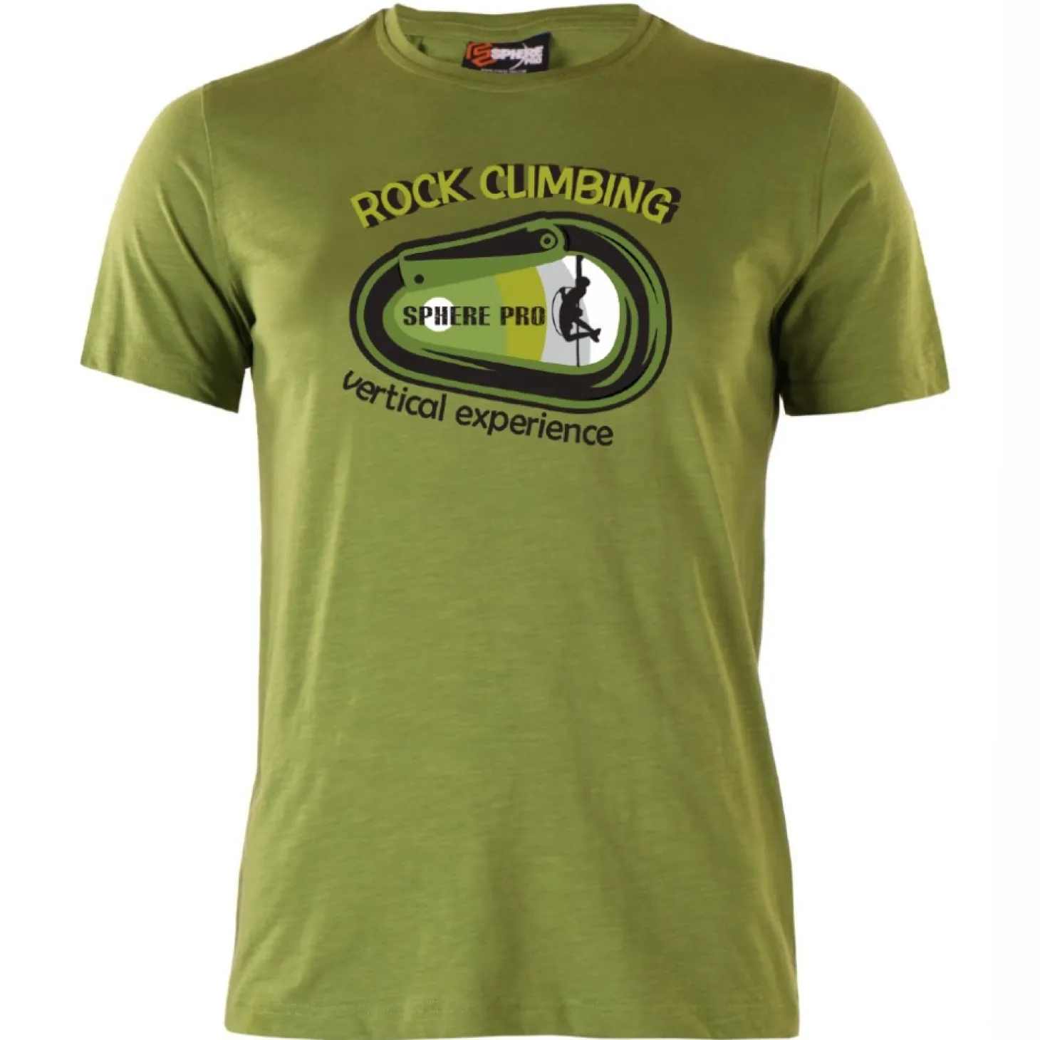 Esta camiseta en color verde de Sphere Pro ha sido confeccionado en un 100% algodón para brindar al usuario la máxima comodidad posible, así como una gran frescura. Con un corte regular para adaptarse a cualquier contorno, lleva cuello redondo acanalado para una estética perfecta y el dibujo estampado en el pecho de un mosquetón con un escalador hace que sea muy atractiva, a la que vez que sencilla.